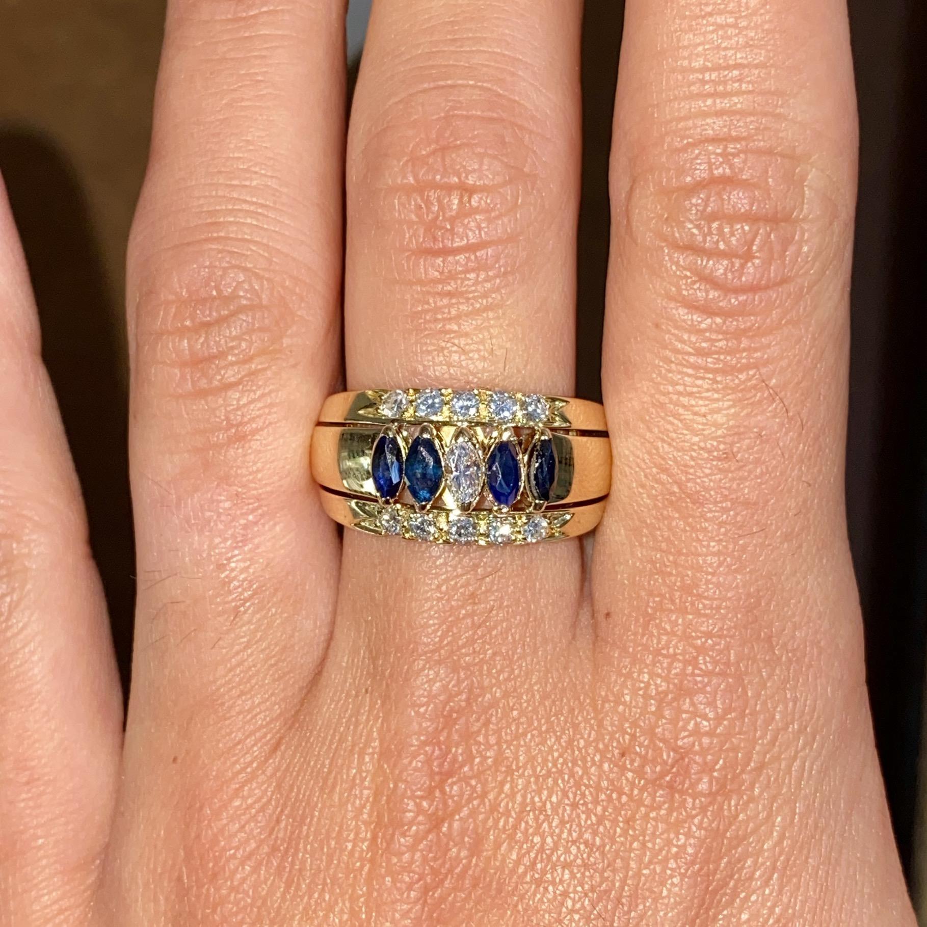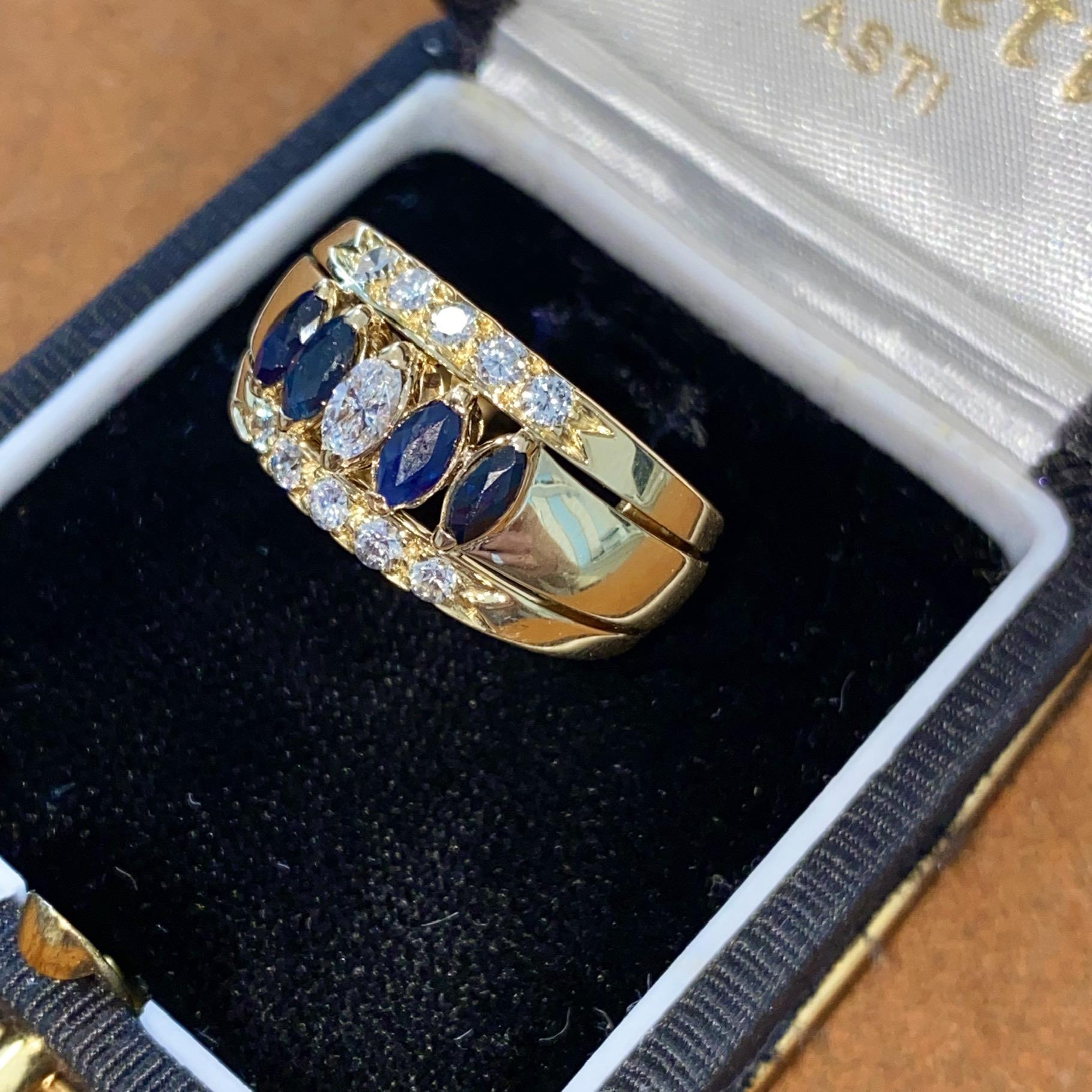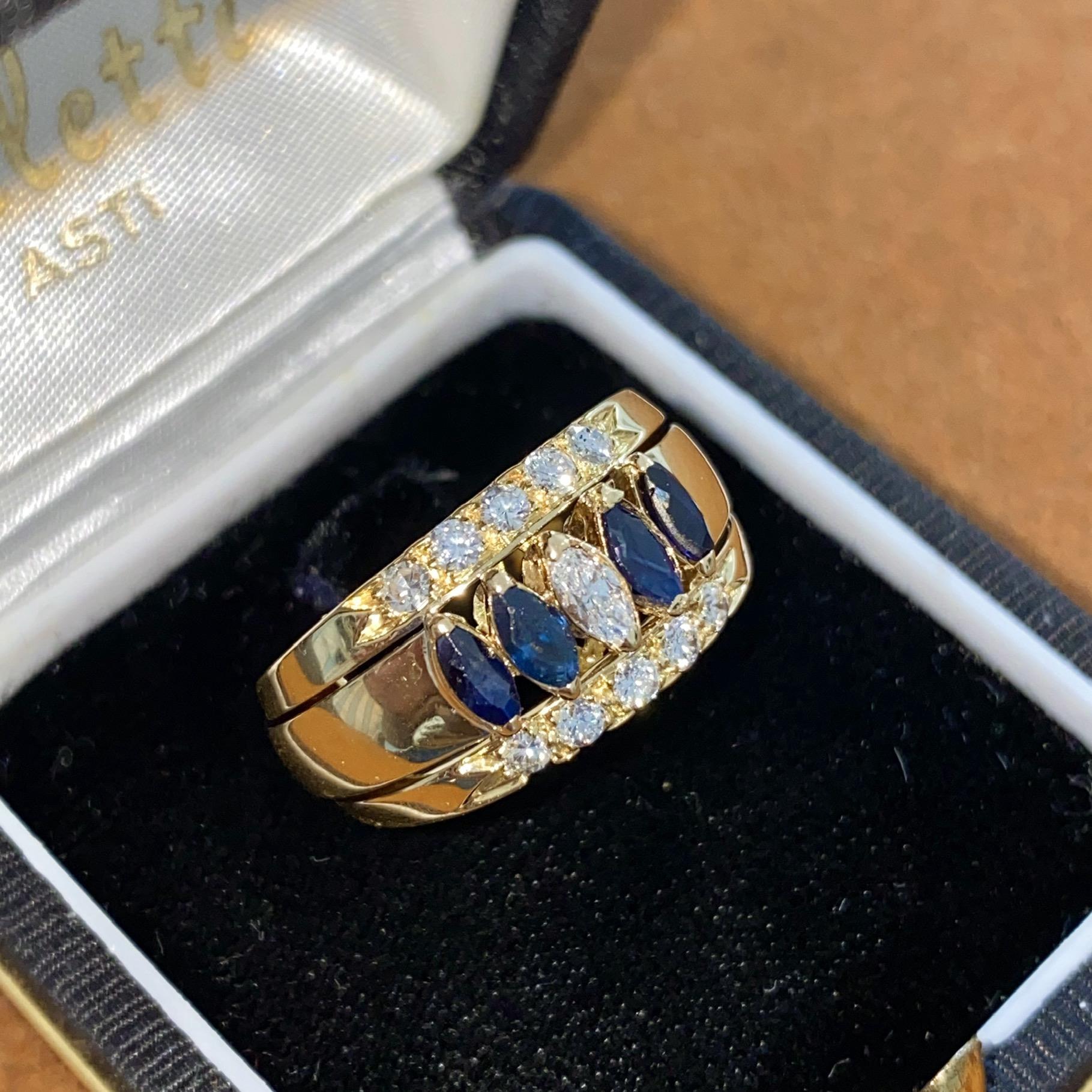 Oro 18kt, zaffiri naturali di taglio navette e diamanti naturali di taglio navette e taglio brillante G, VS2 ca.