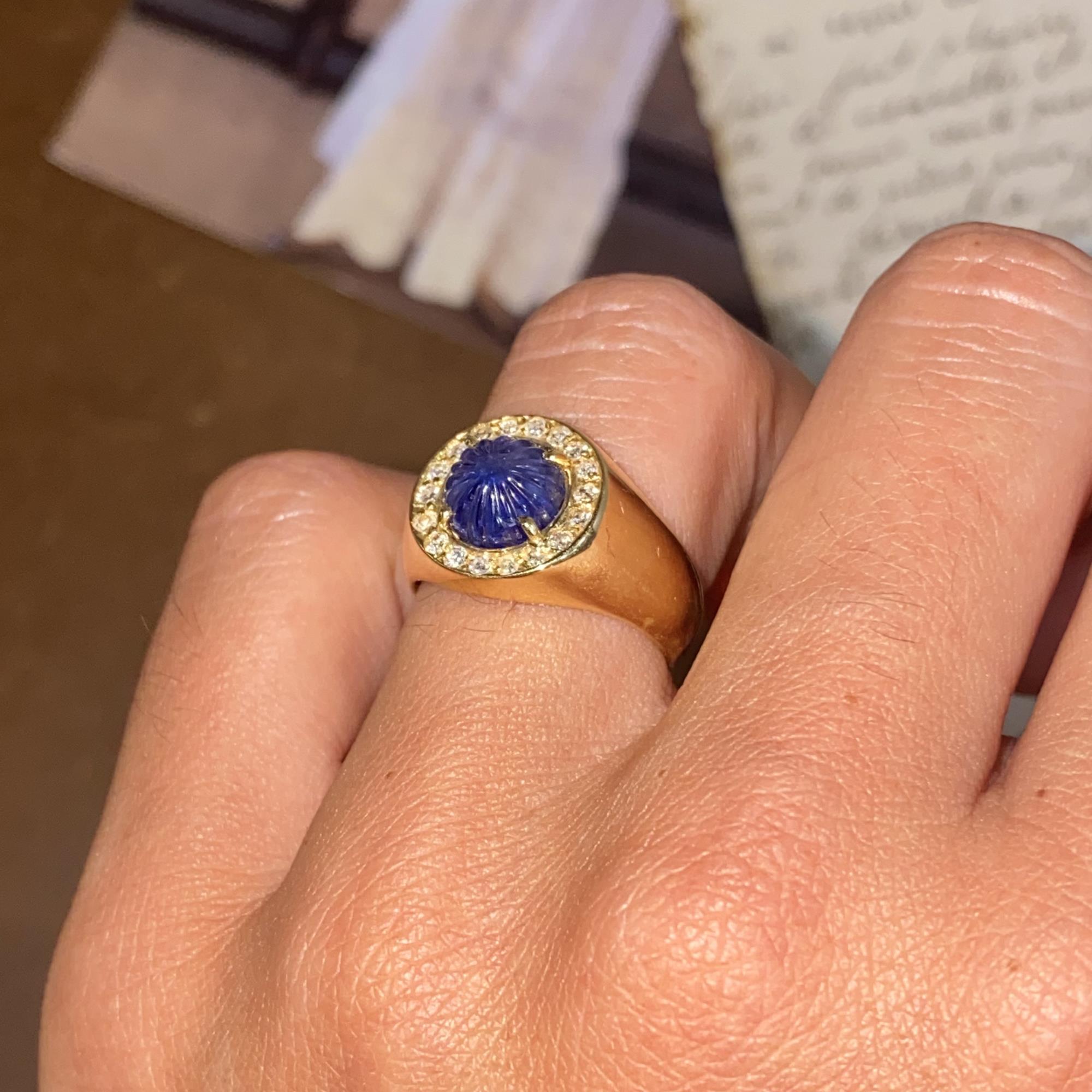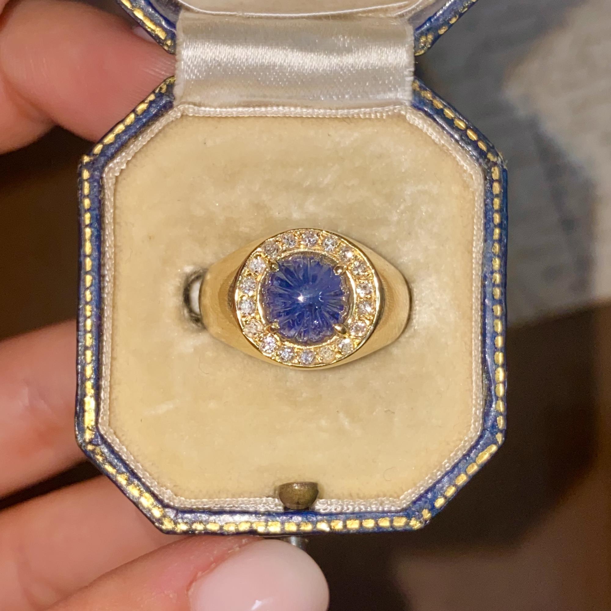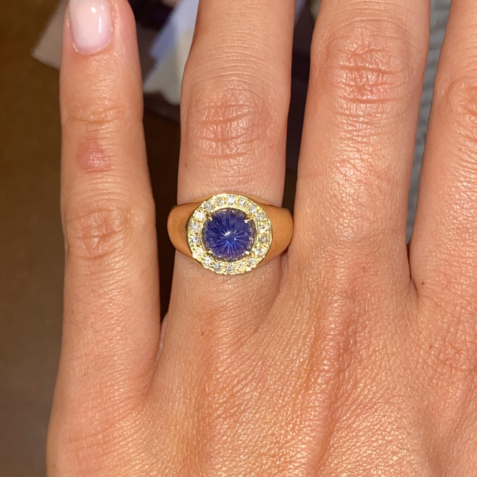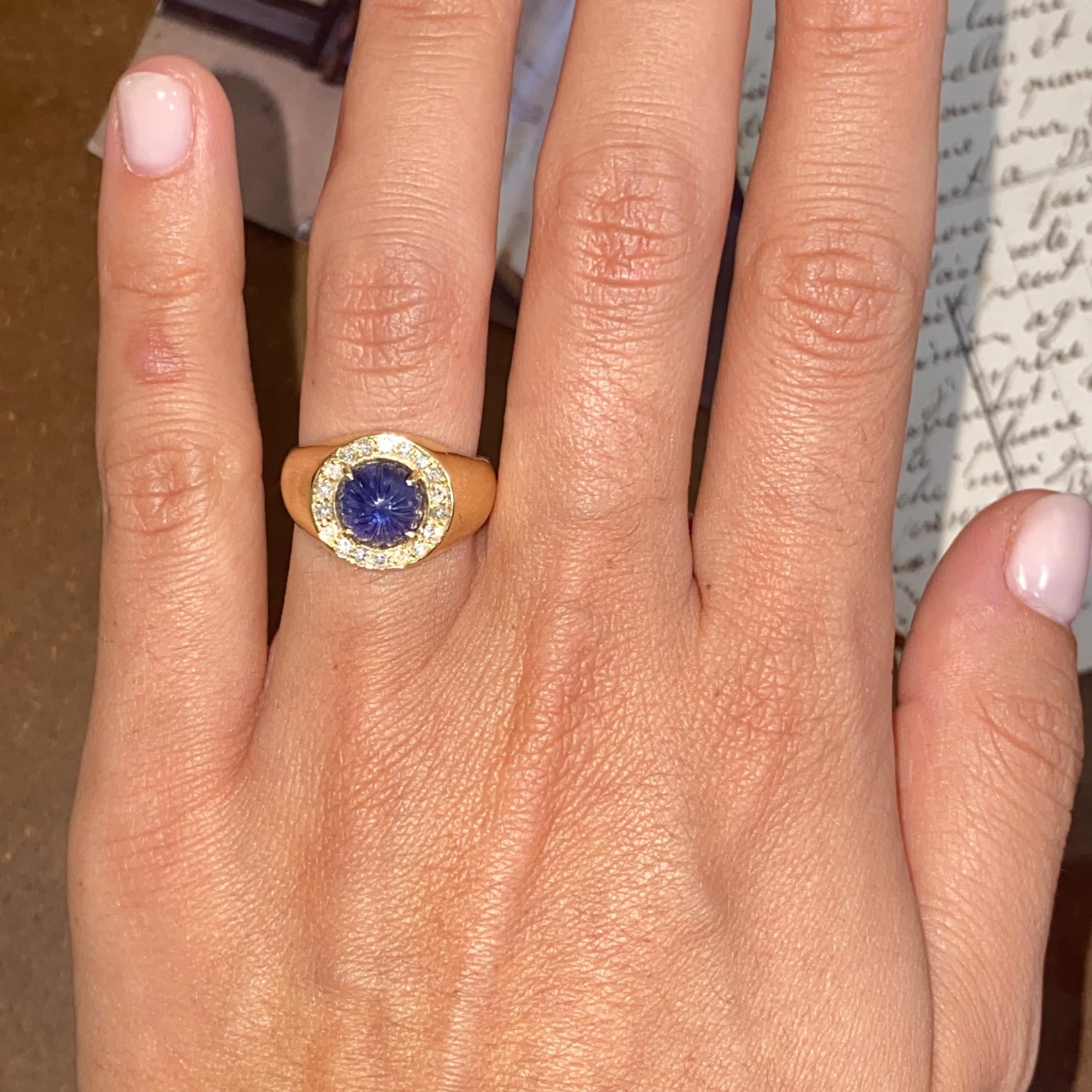 Oro 18kt, zaffiro naturale scolpito e diamanti naturali