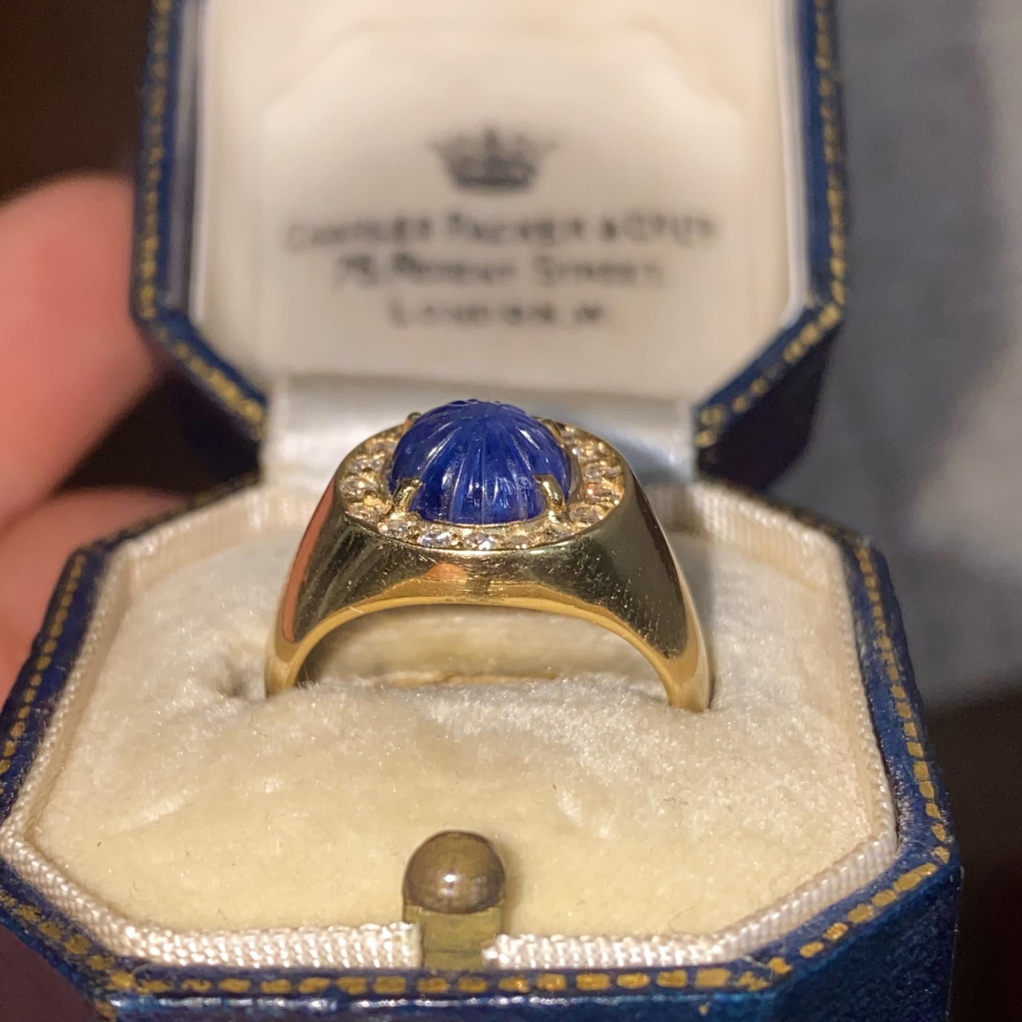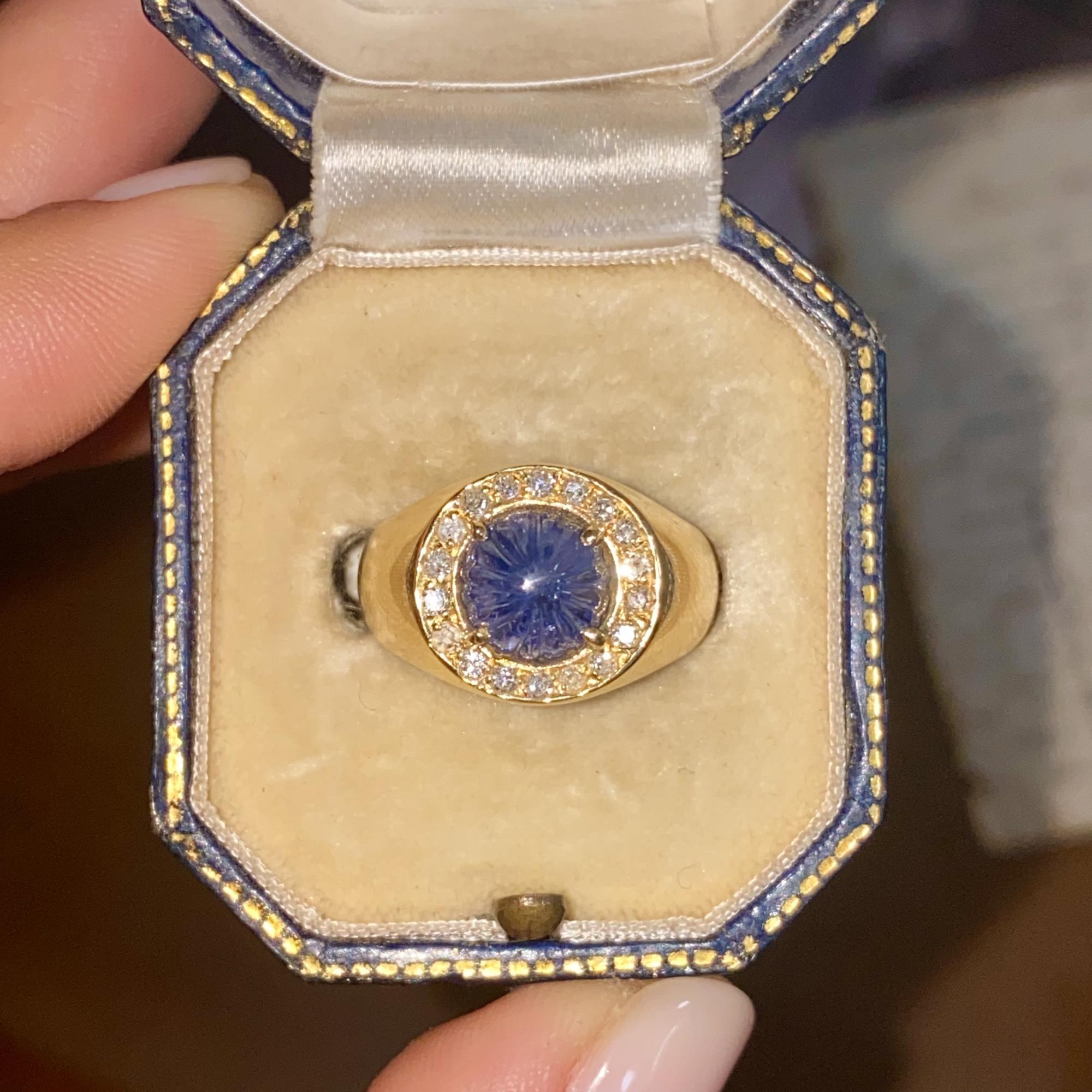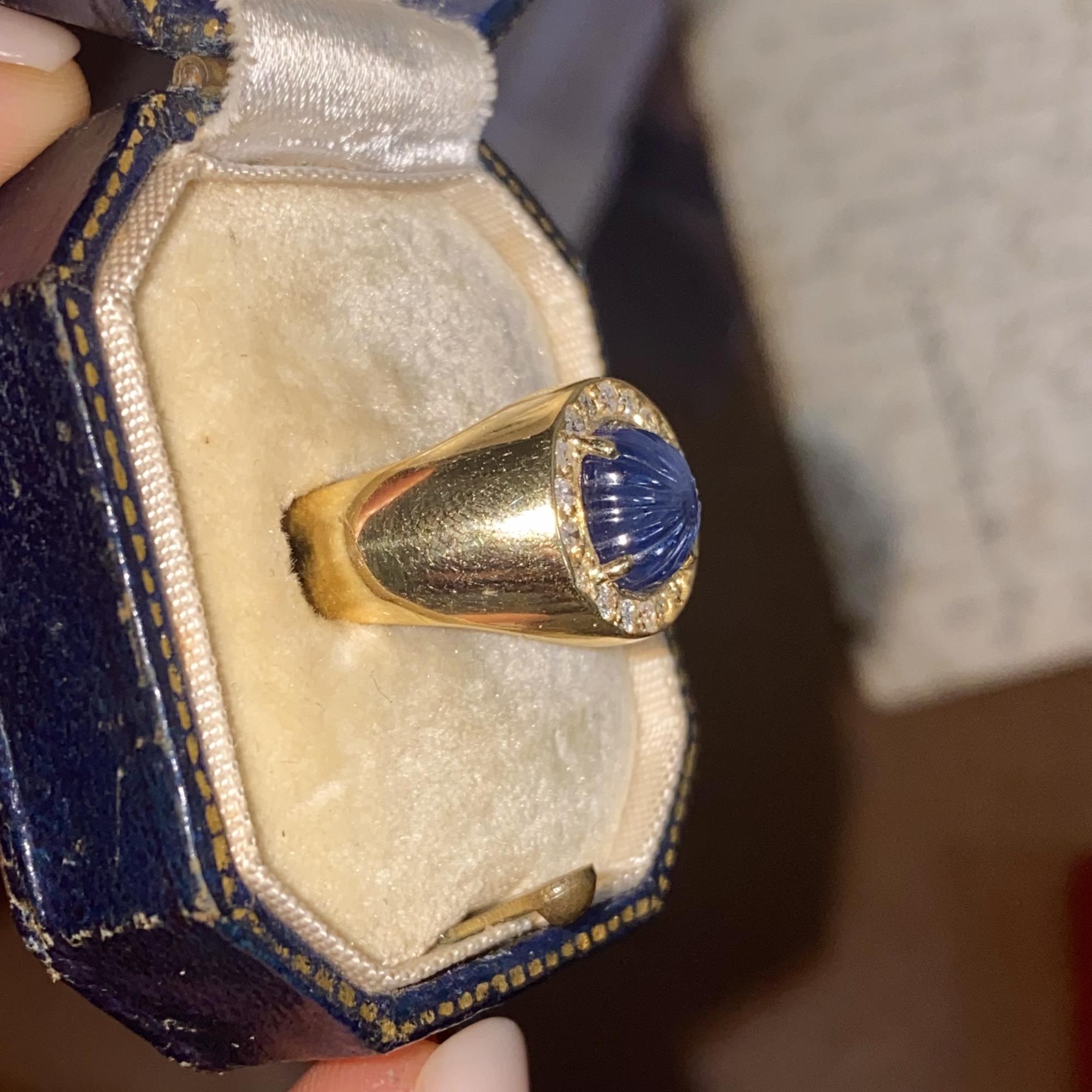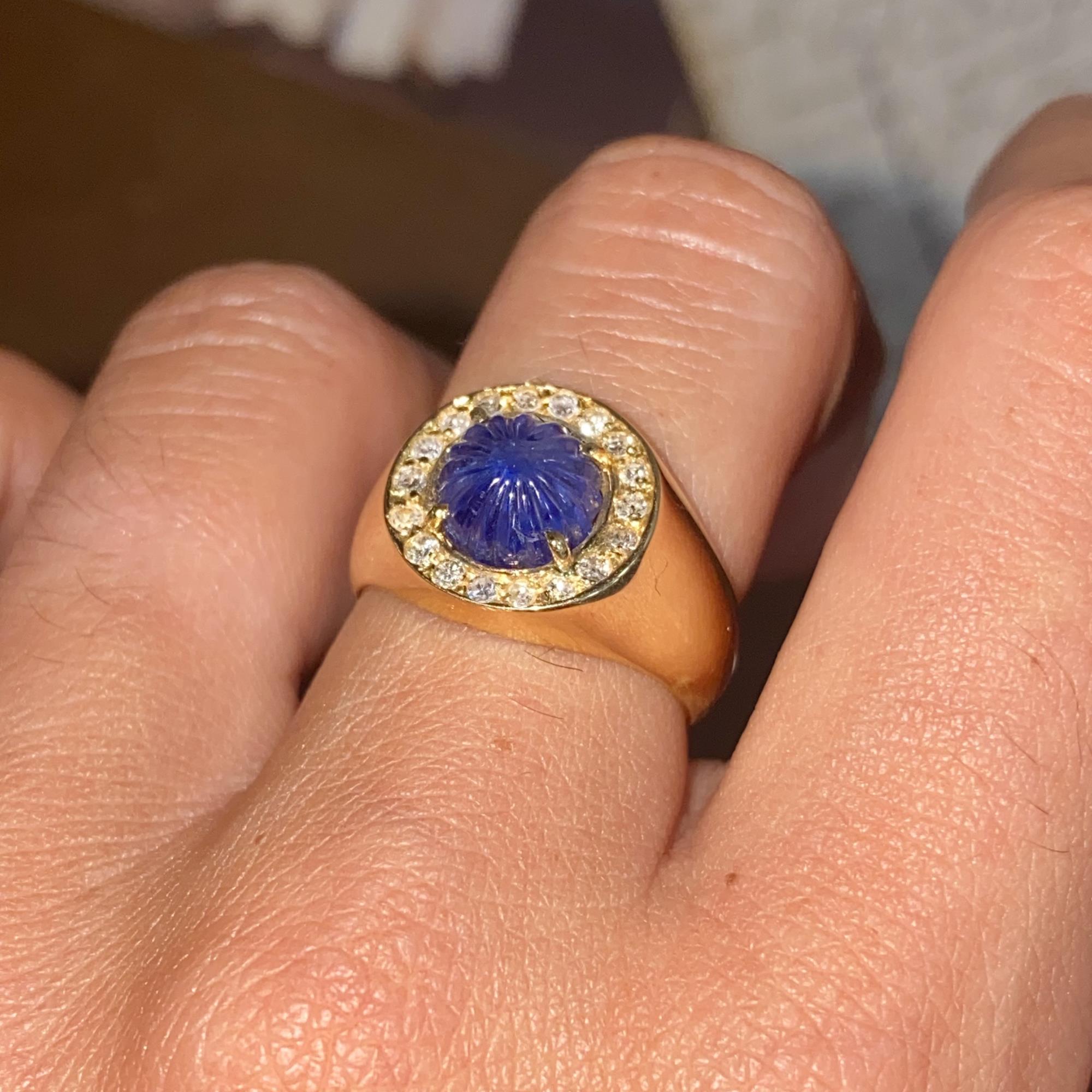 Oro 18kt, zaffiro naturale scolpito e diamanti naturali