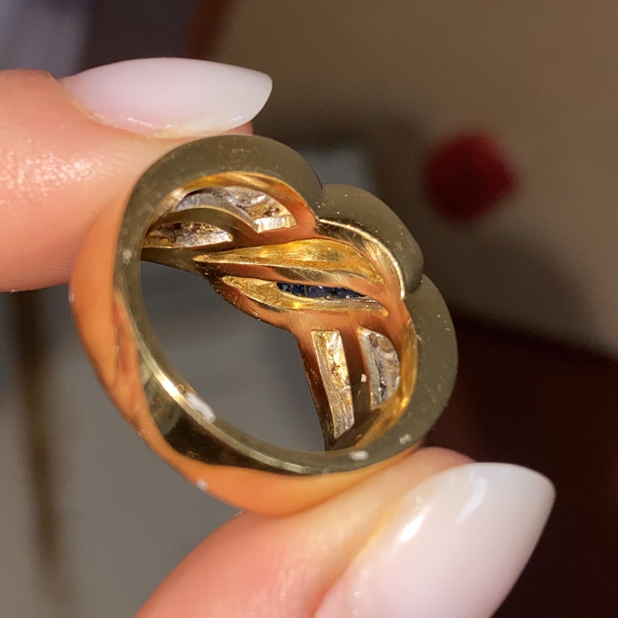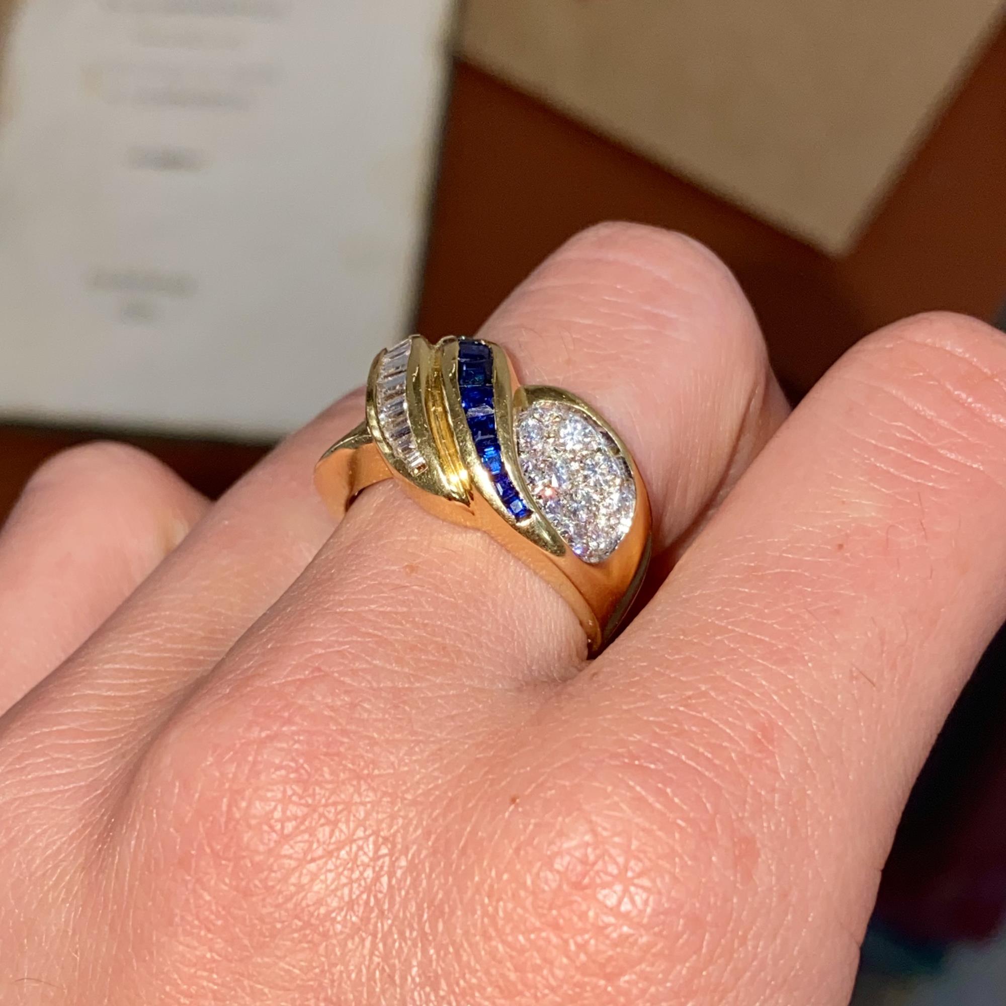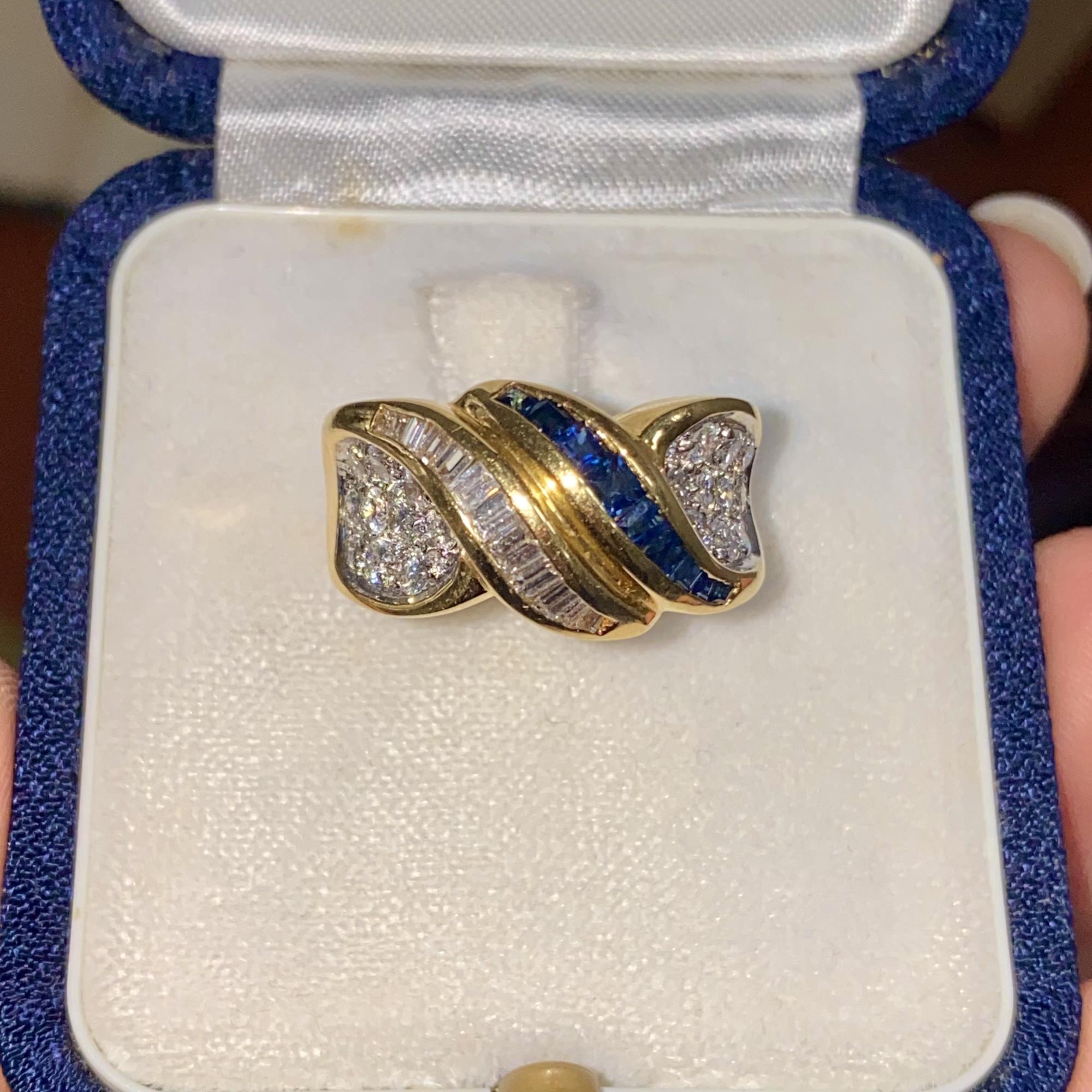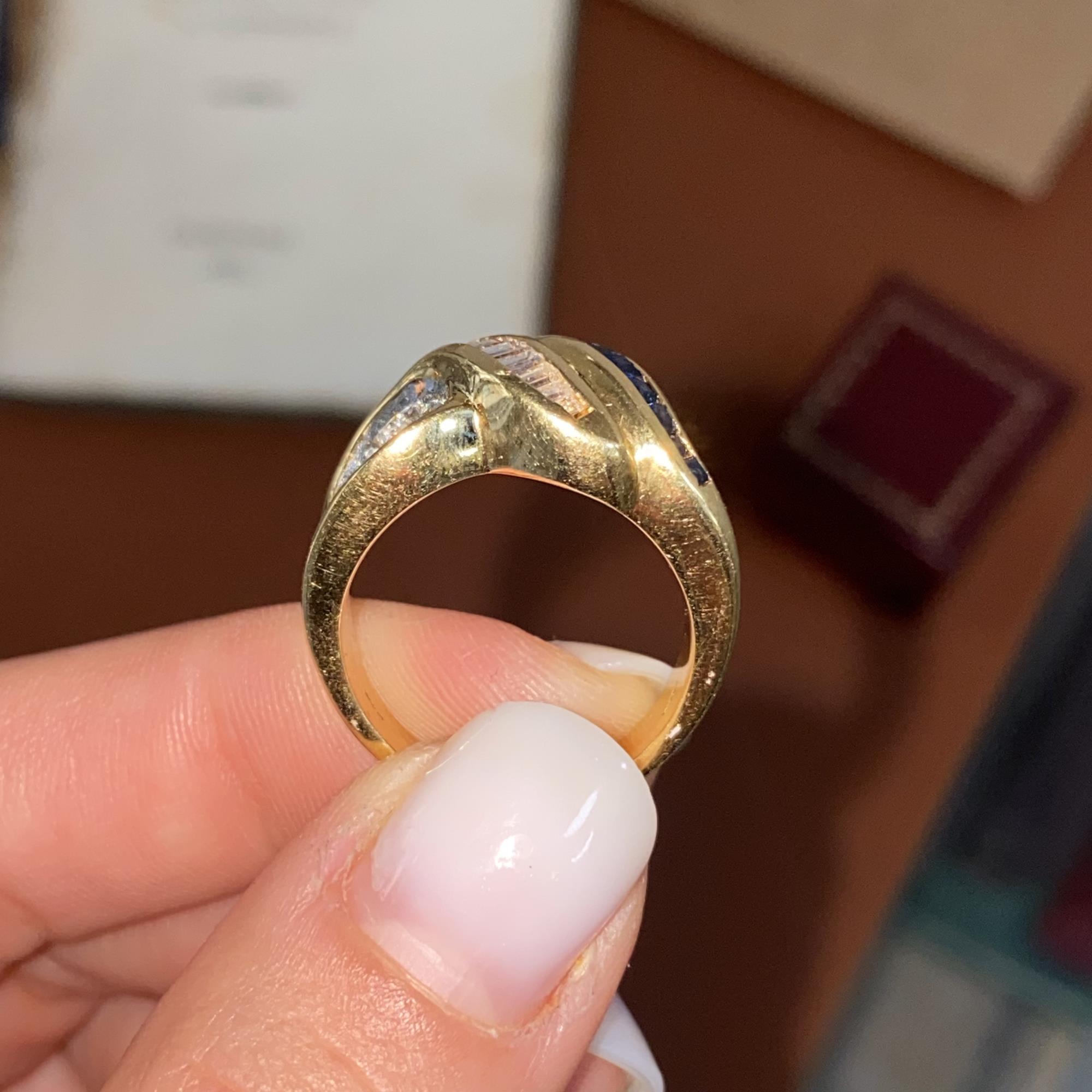 Oro 18kt, zaffiri naturali di taglio princess, diamanti naturali di taglio baguette e taglio brillante G, VS2 ca.