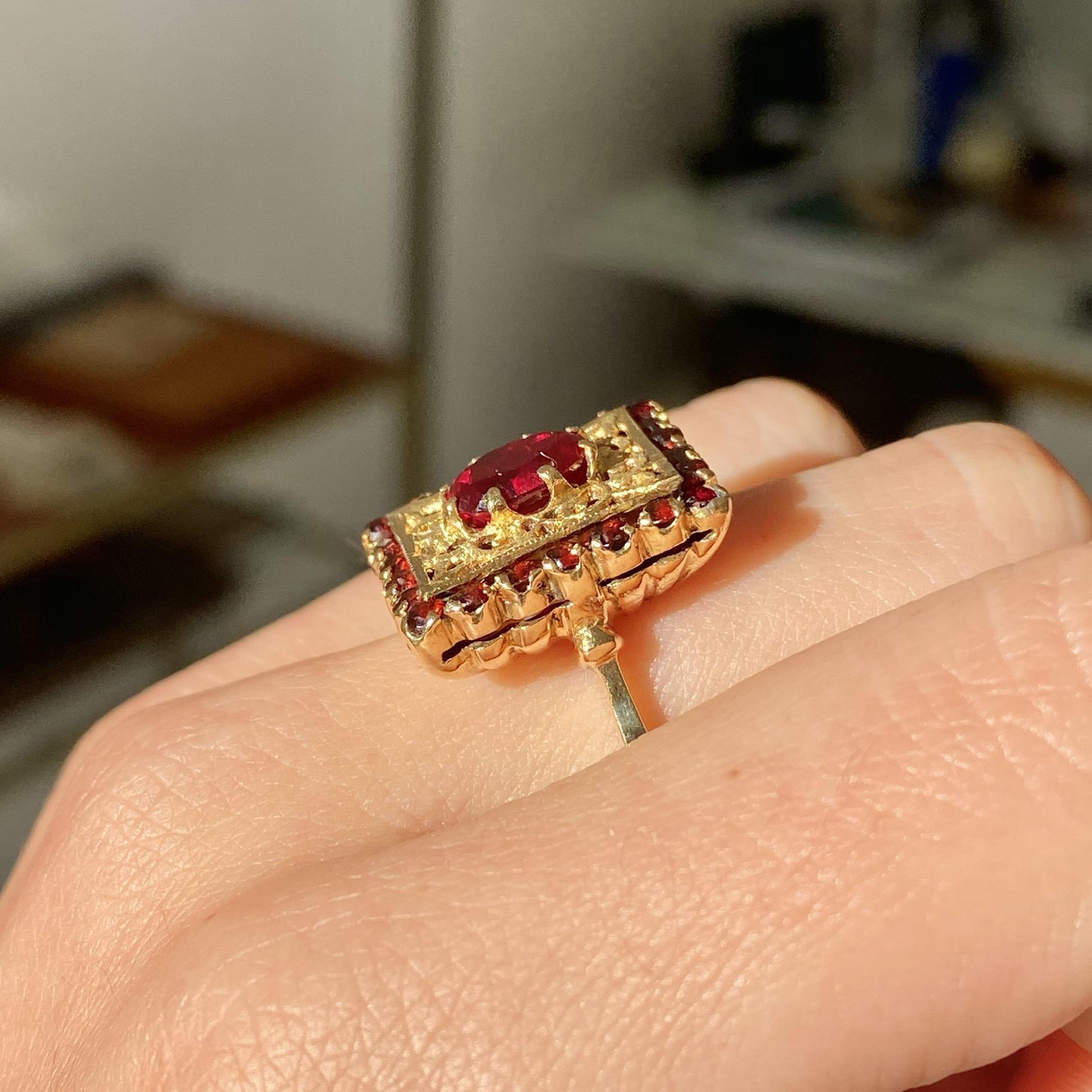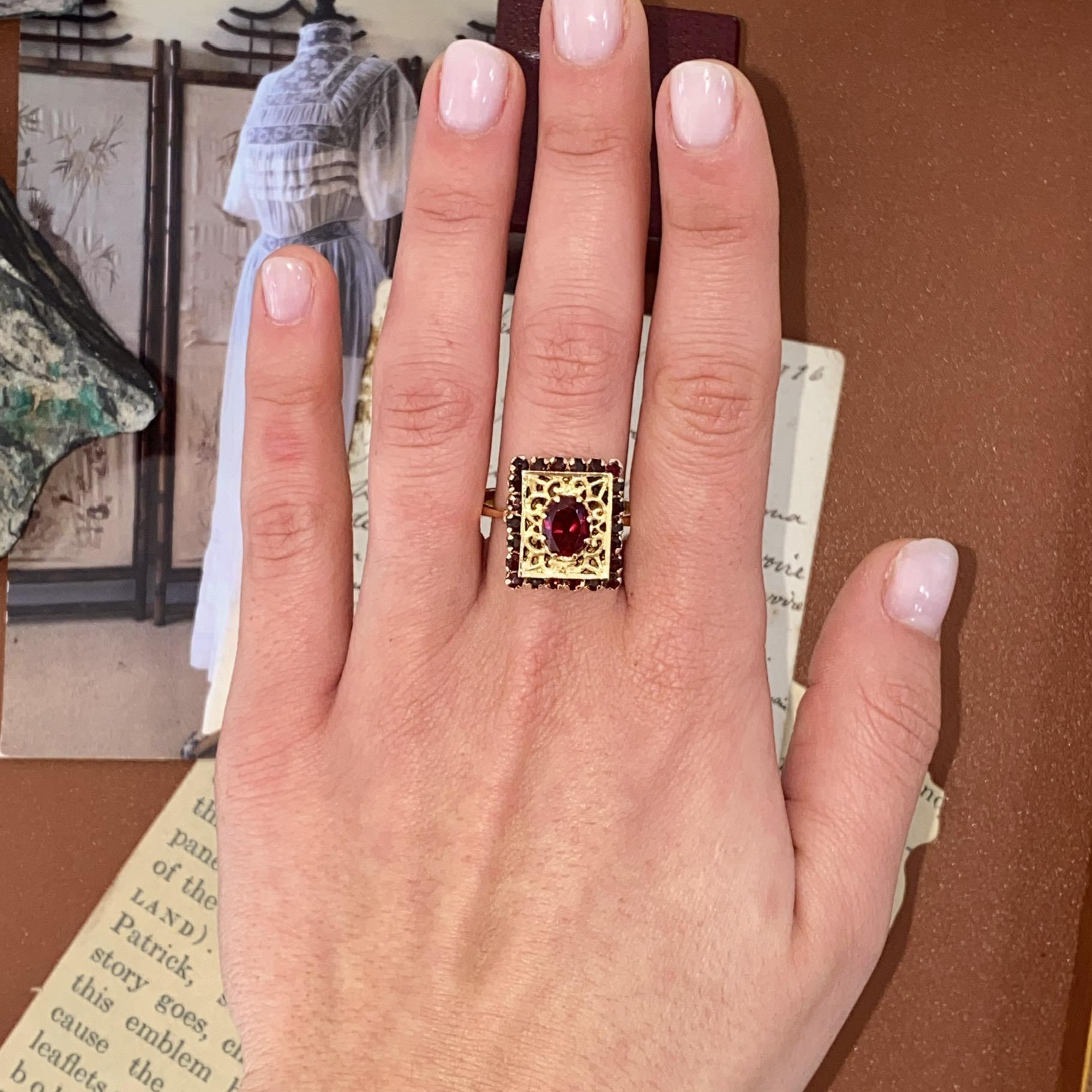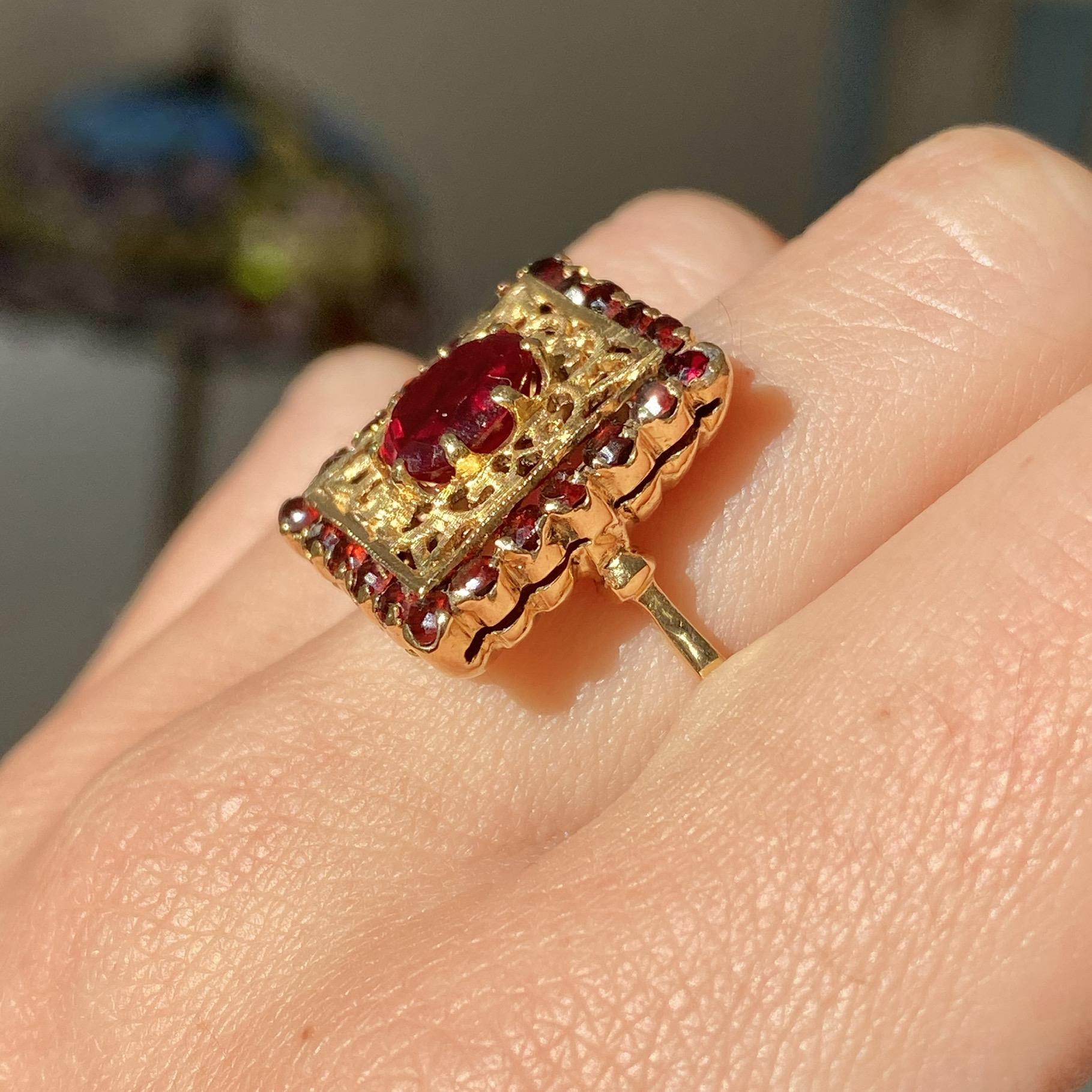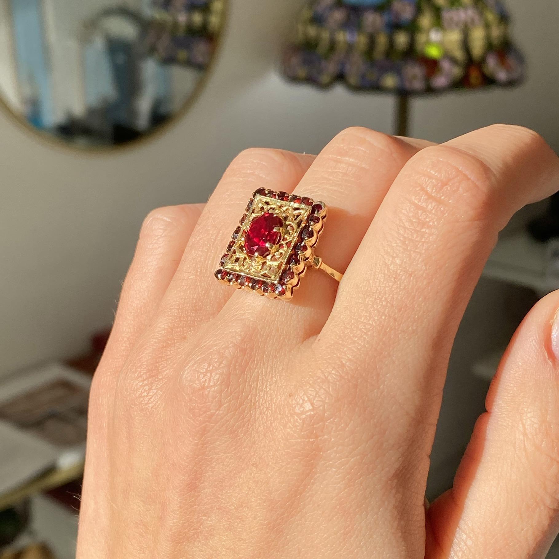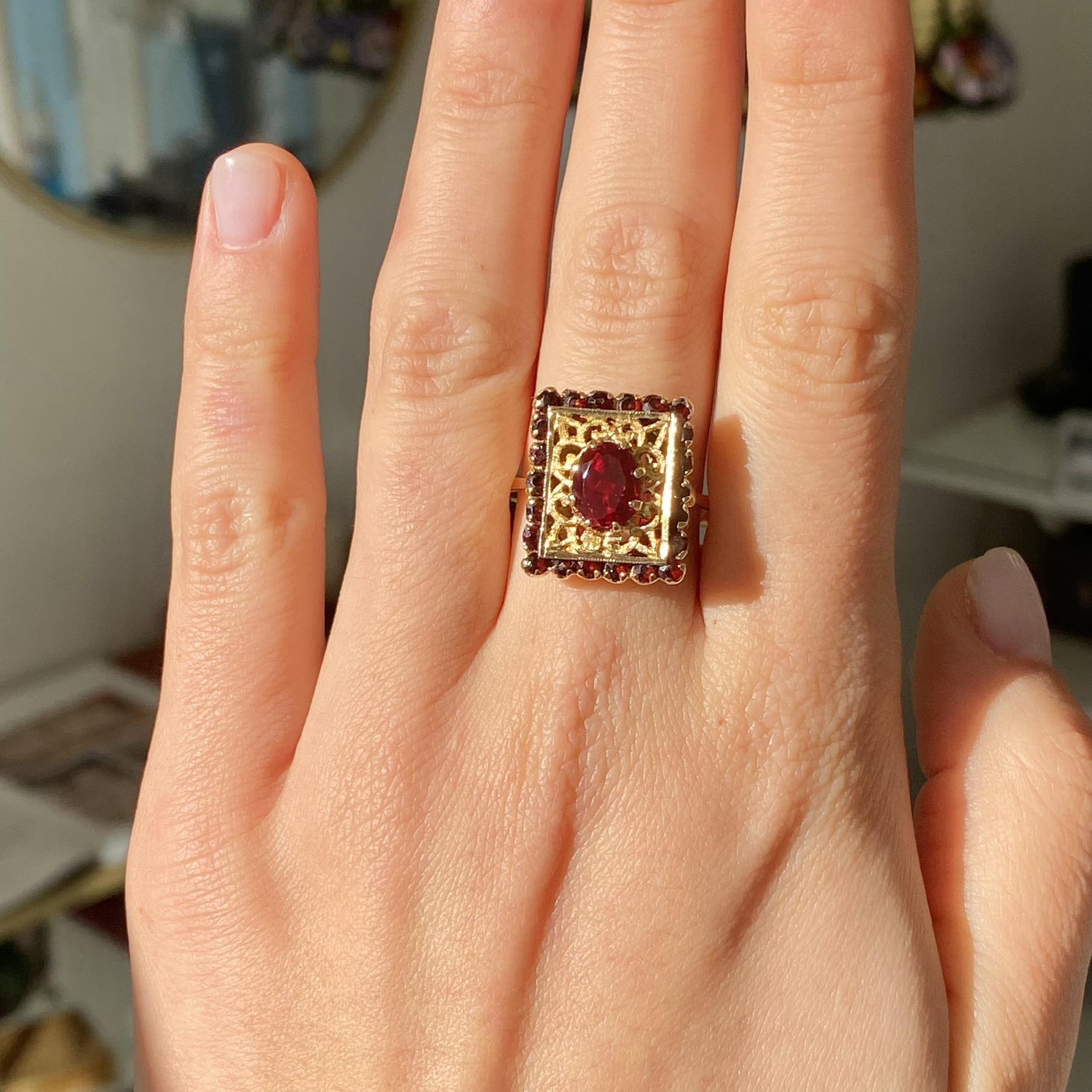 ANELLO VINTAGE IN ORO 18KT CON GRANATI E DECORAZIONI A TRAFORO