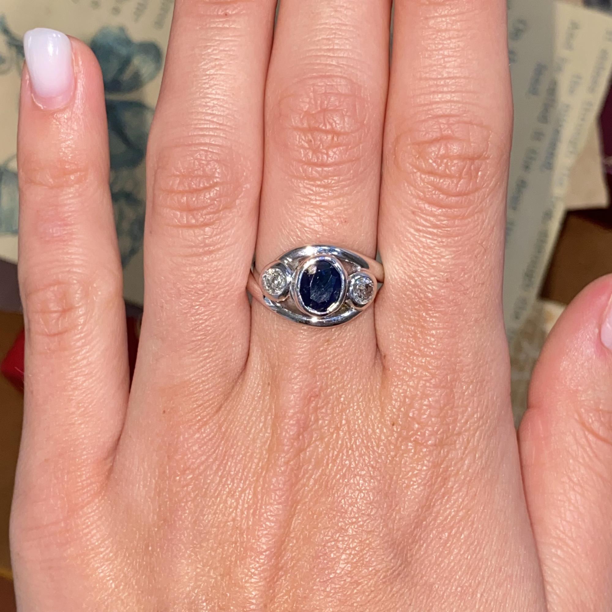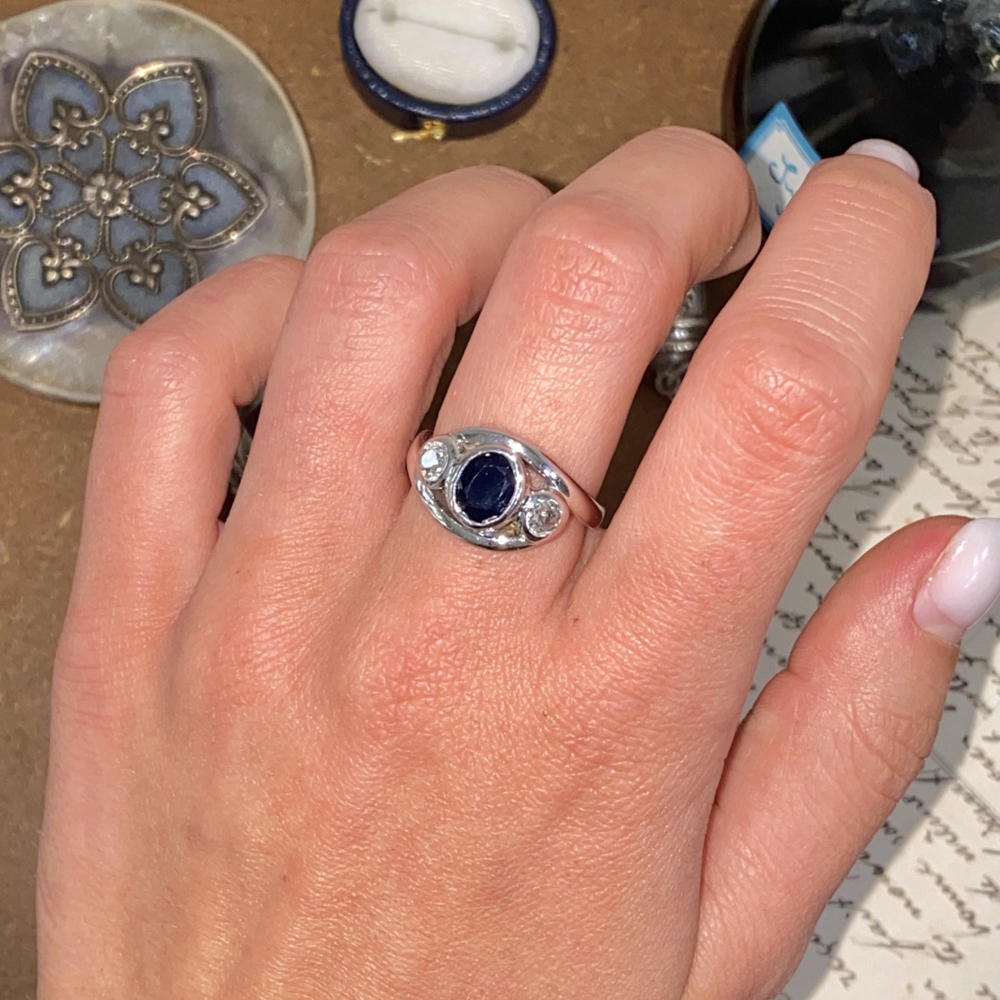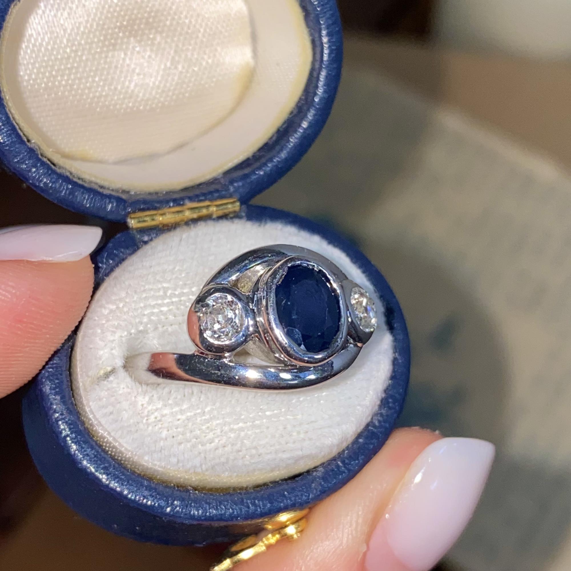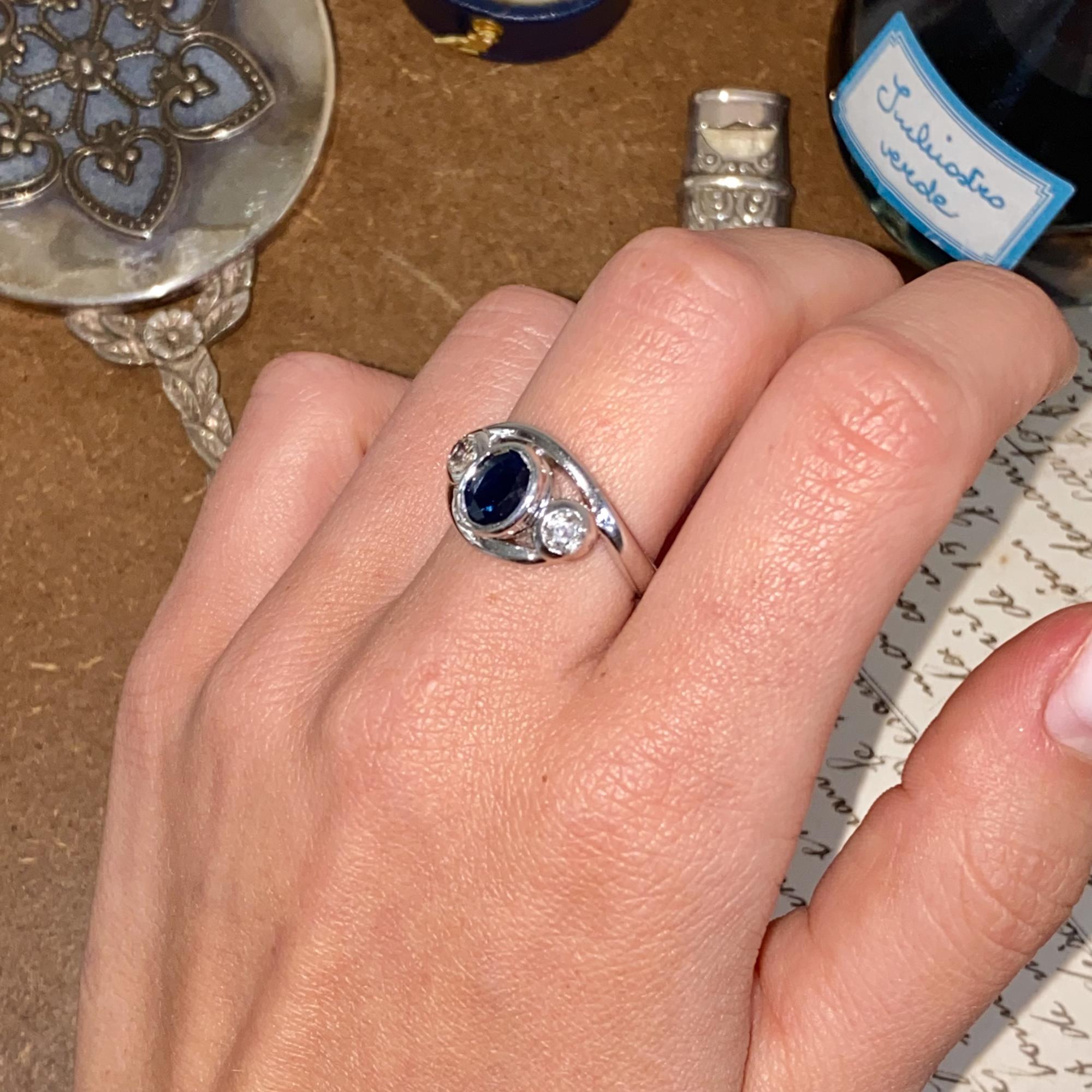 ANELLO VINTAGE IN ORO 18KT CON ZAFFIRO CT 1,00 E DIAMANTI TAGLIO VECCHIA EUROPA CT 0,40 CA.
