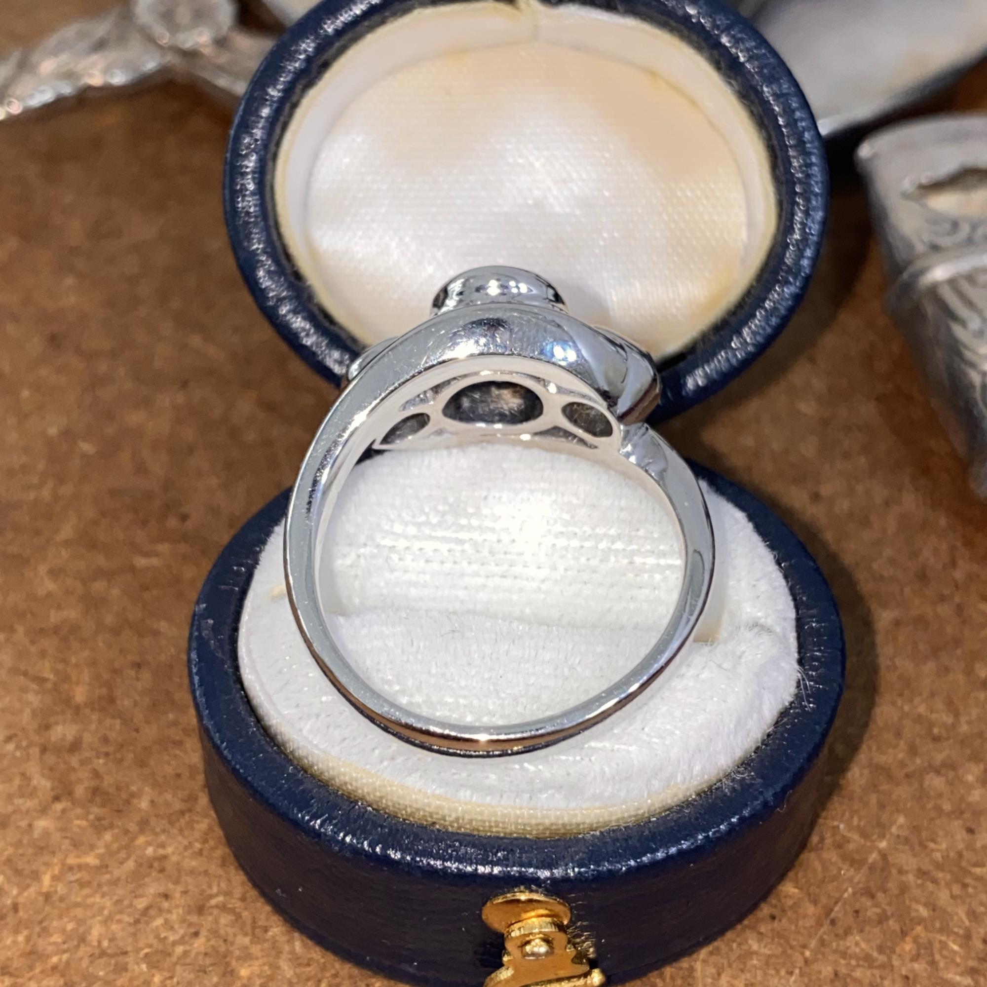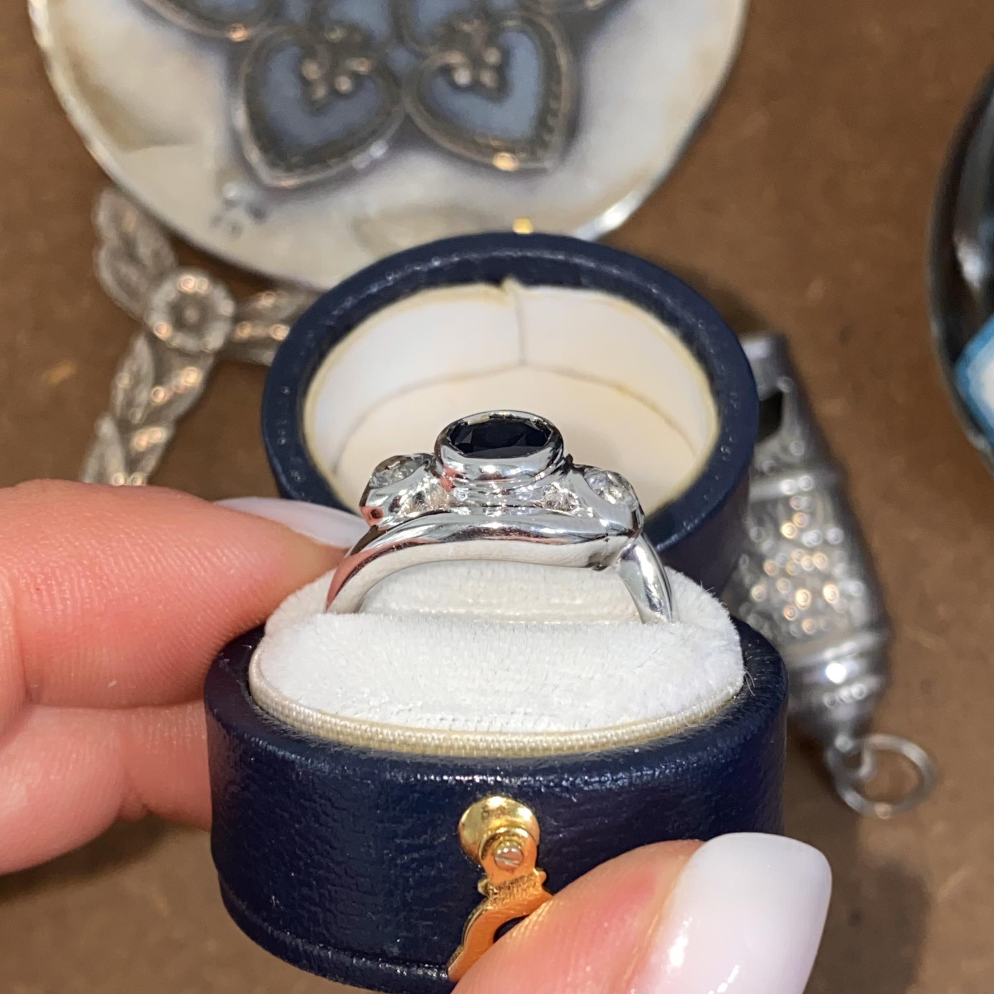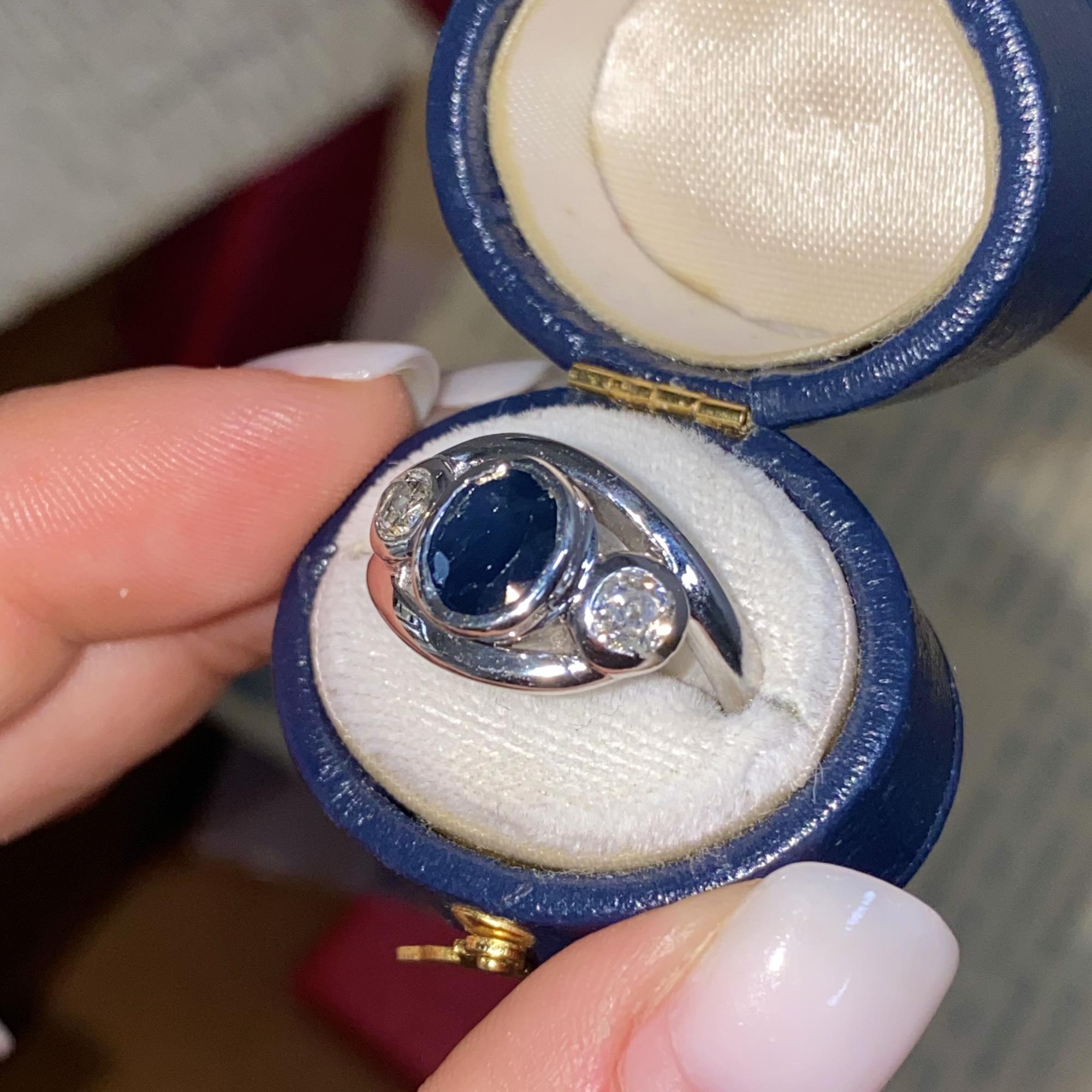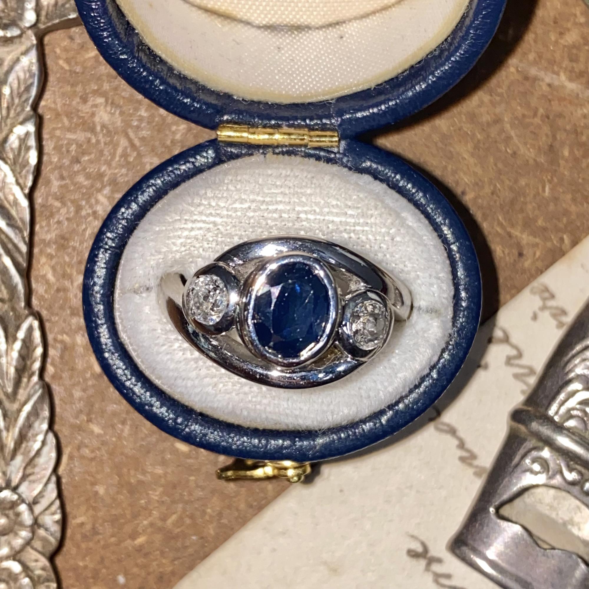 ANELLO VINTAGE IN ORO 18KT CON ZAFFIRO CT 1,00 E DIAMANTI TAGLIO VECCHIA EUROPA CT 0,40 CA.