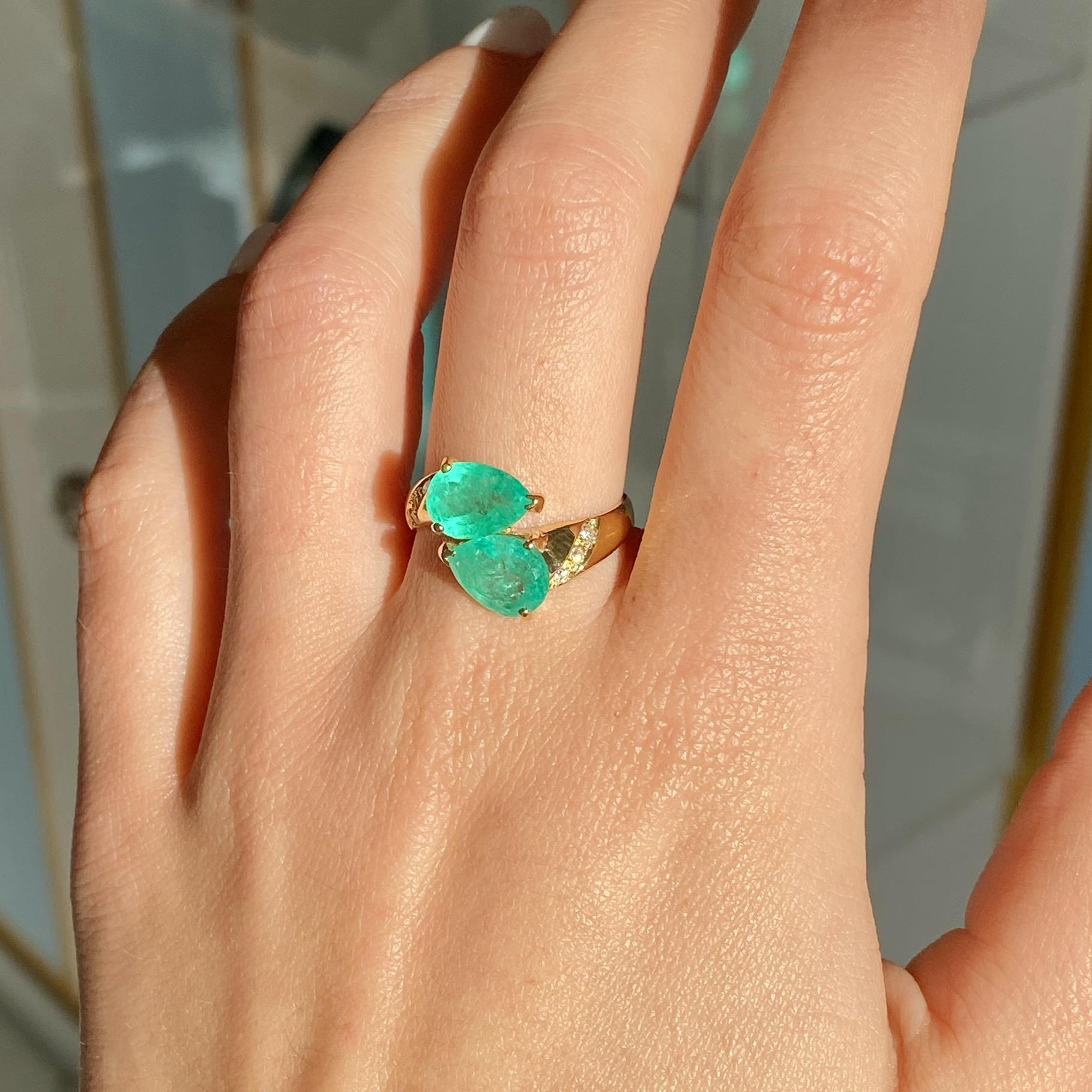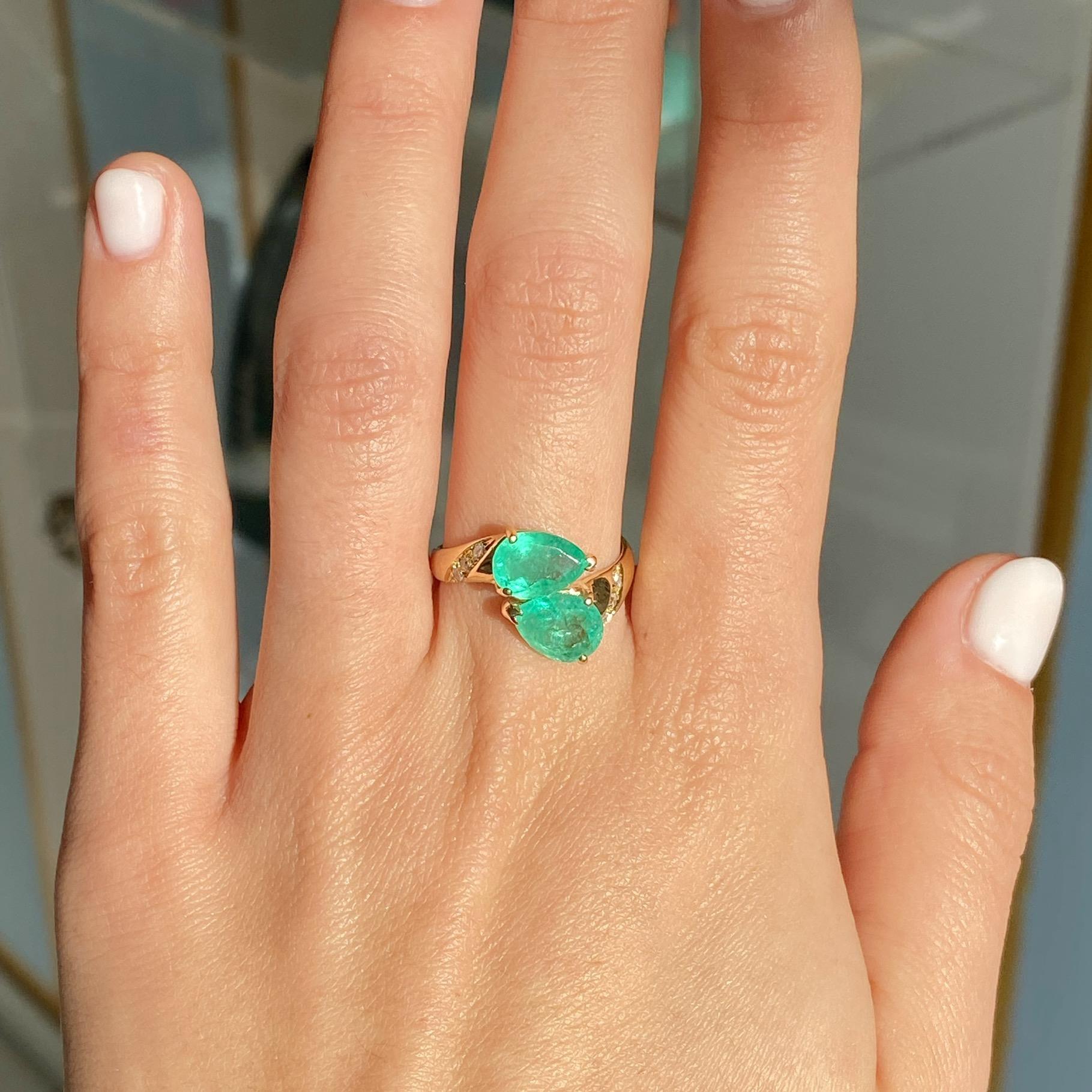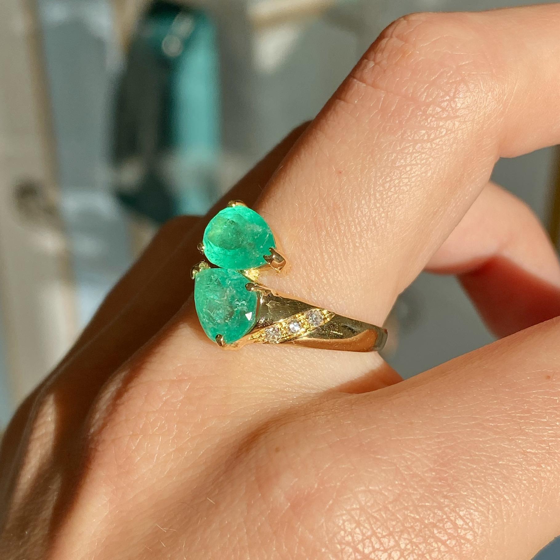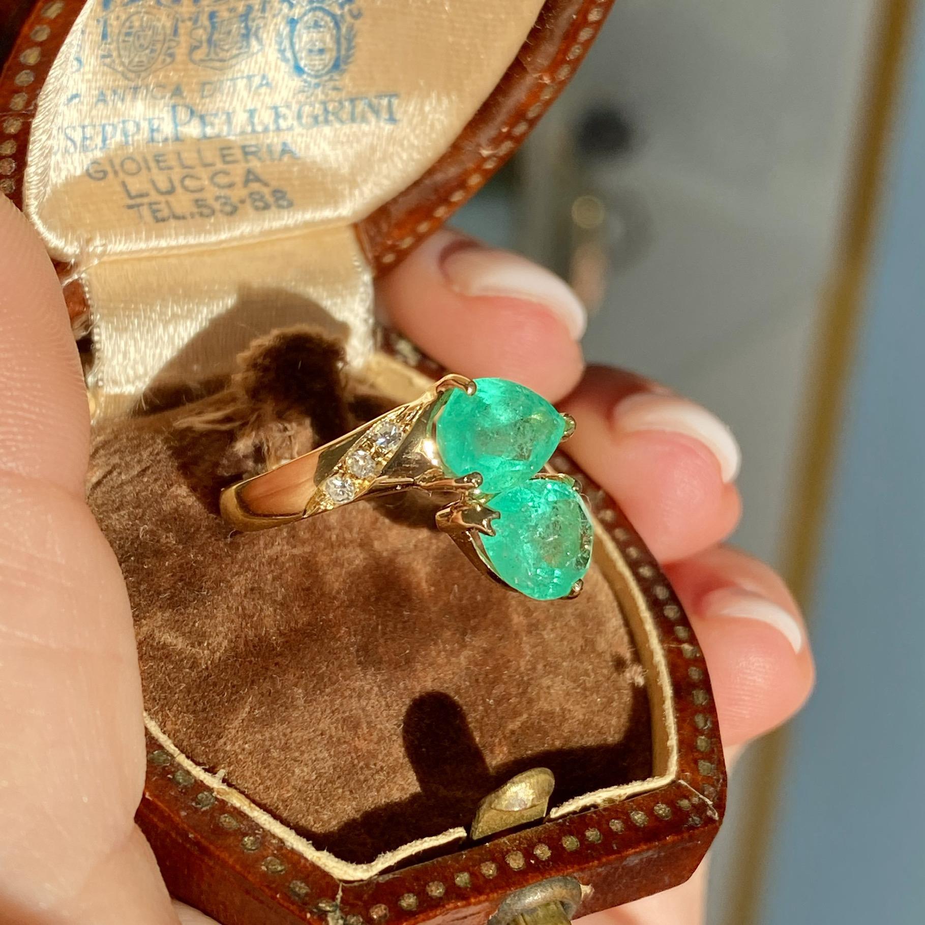 ANELLO VINTAGE IN ORO 18KT CONTRARIÈ CON SMERALDI TAGLIO GOCCIA CT 2,20 CA. E DIAMANTI CT 0,06