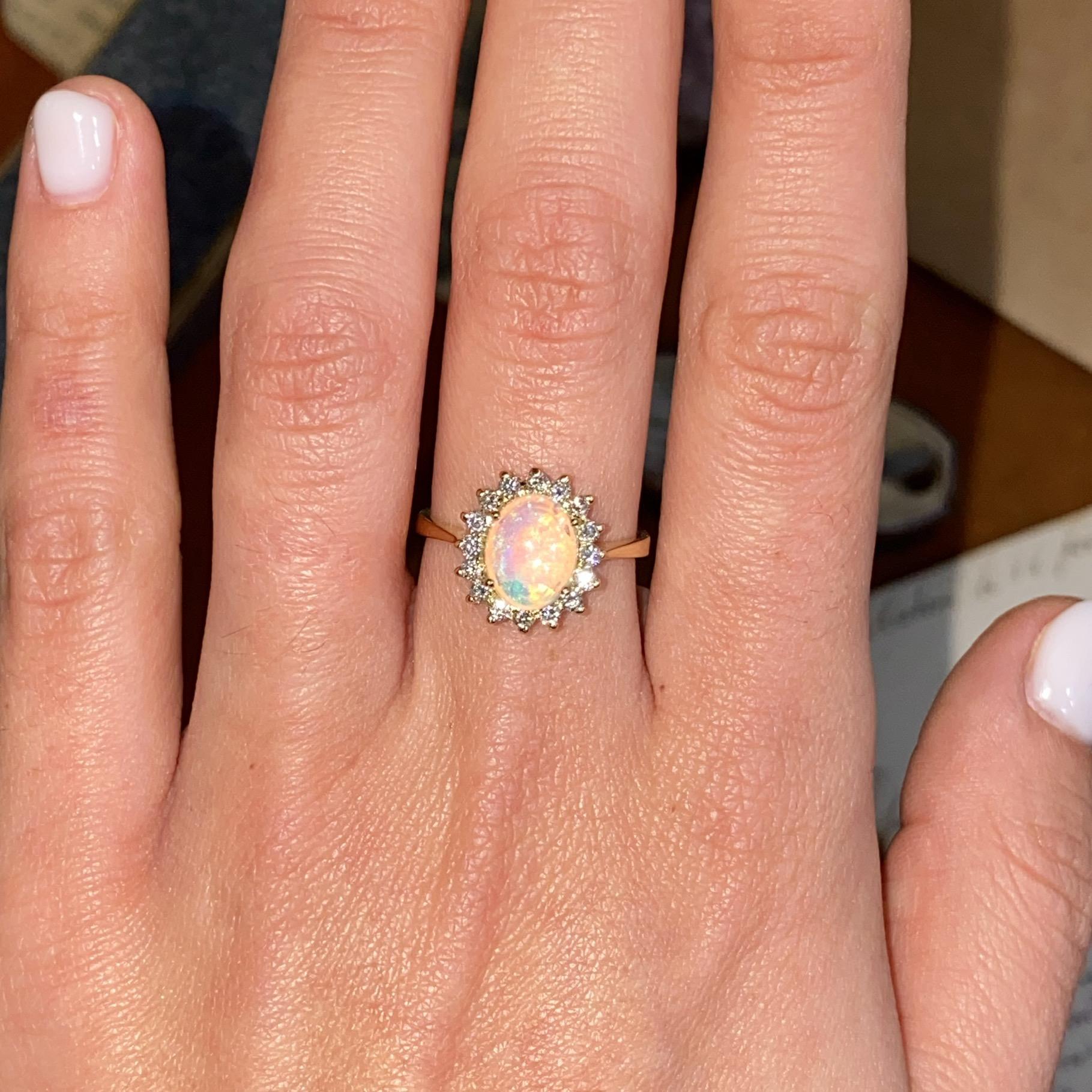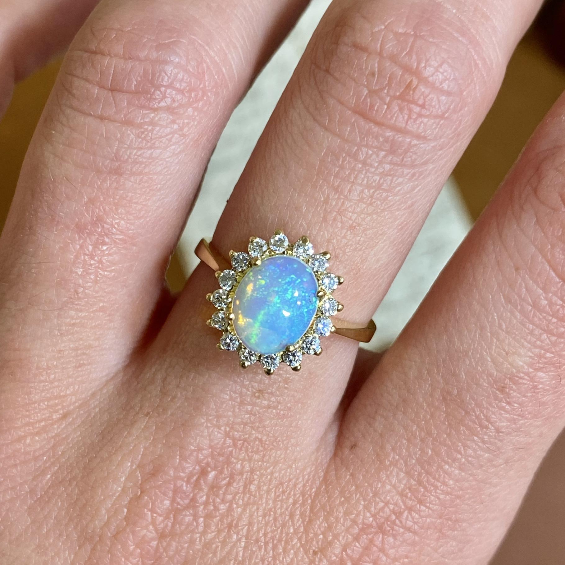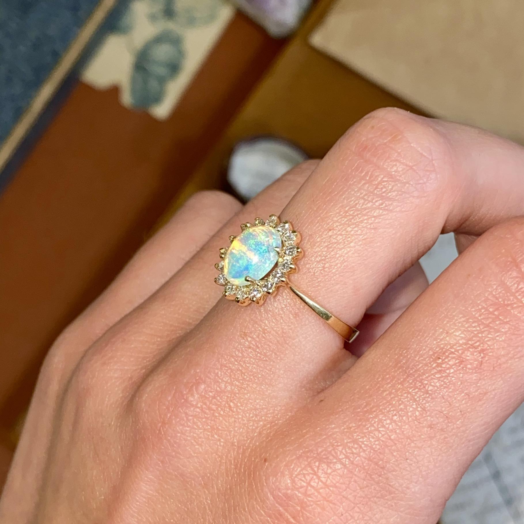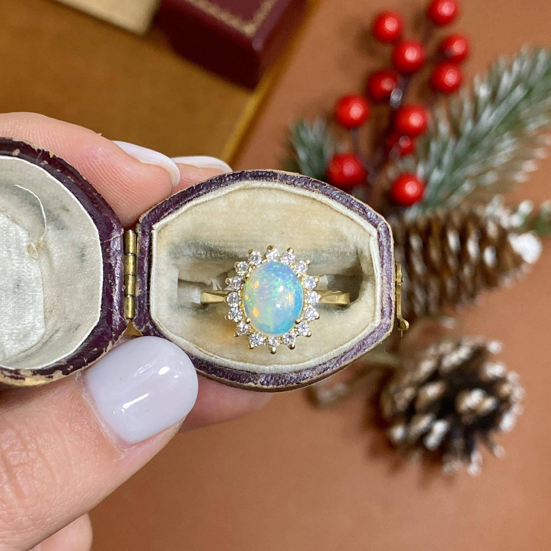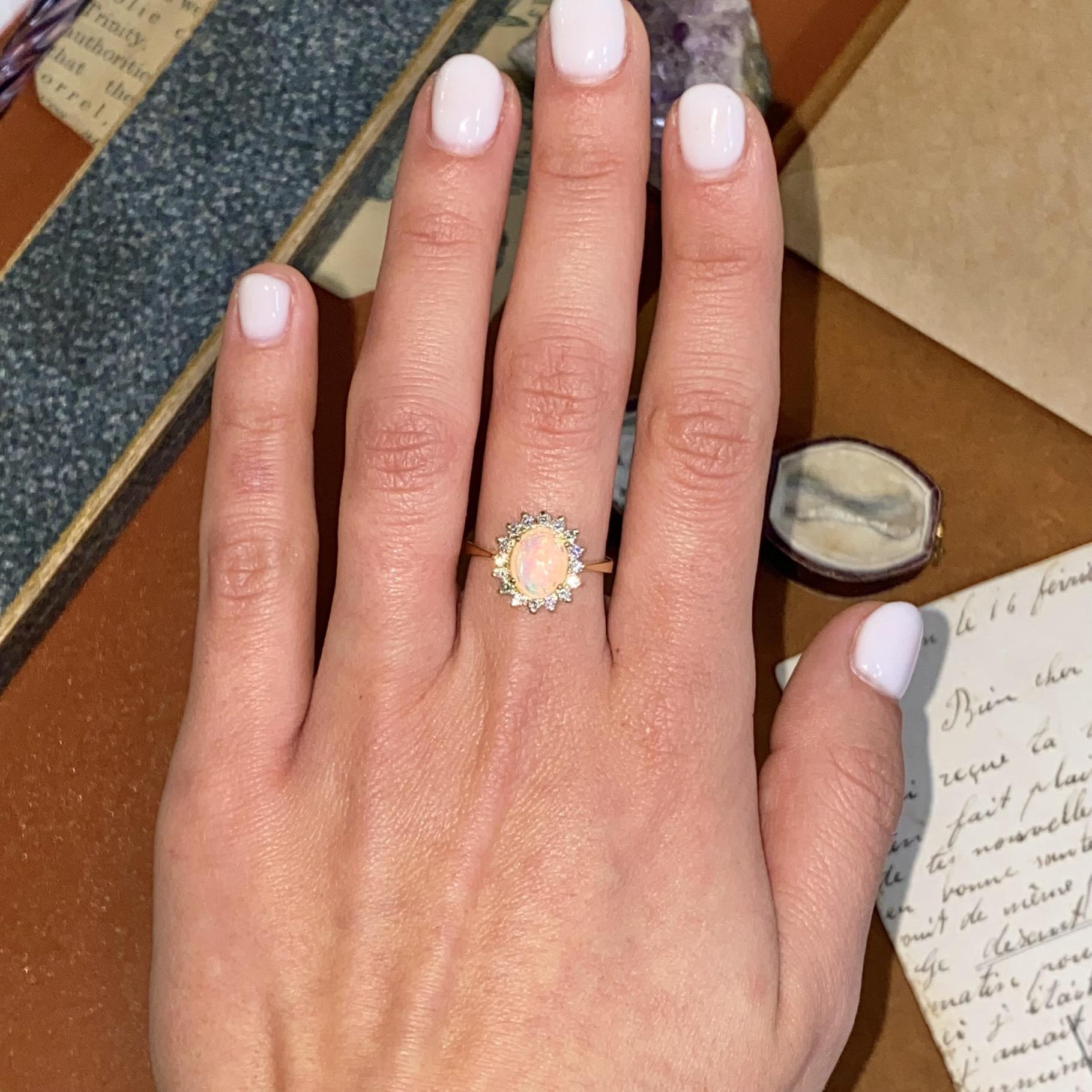 ANELLO VINTAGE MARGHERITA IN ORO 18KT CON OPALE CT 1,00 CA. E DIAMANTI CT 0,30 CA.