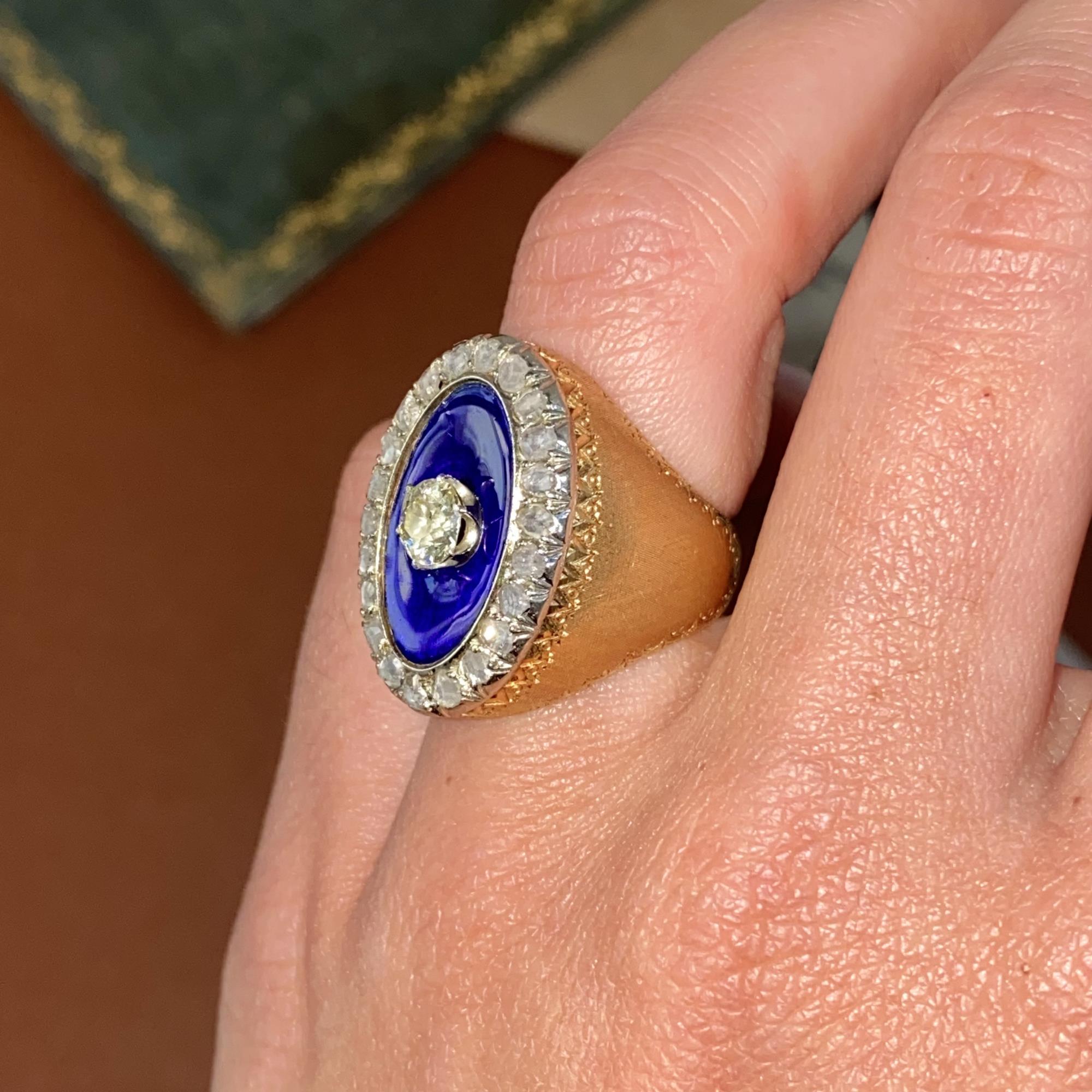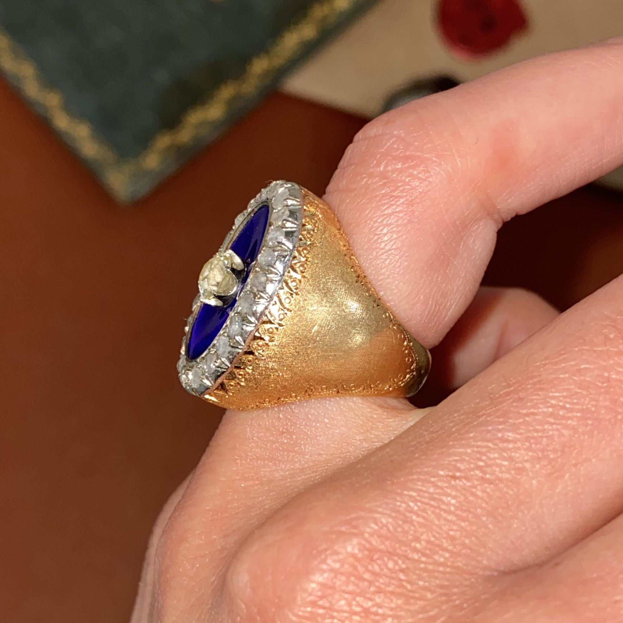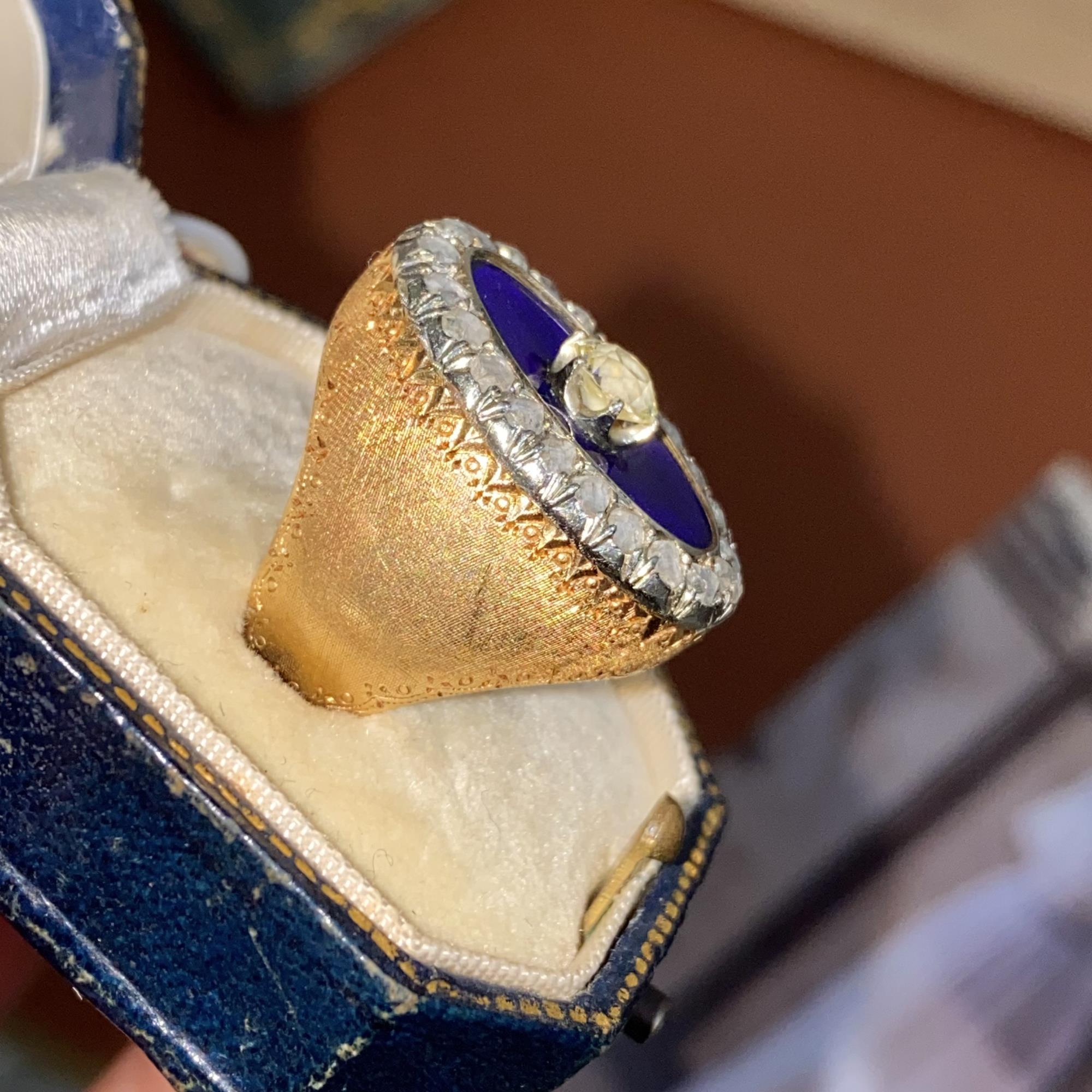 Oro 18kt decorato a mano, diamanti di taglio antico e smalto blu. E' un autentico e meraviglioso pezzo di storia, testimone di un'epoca passata.