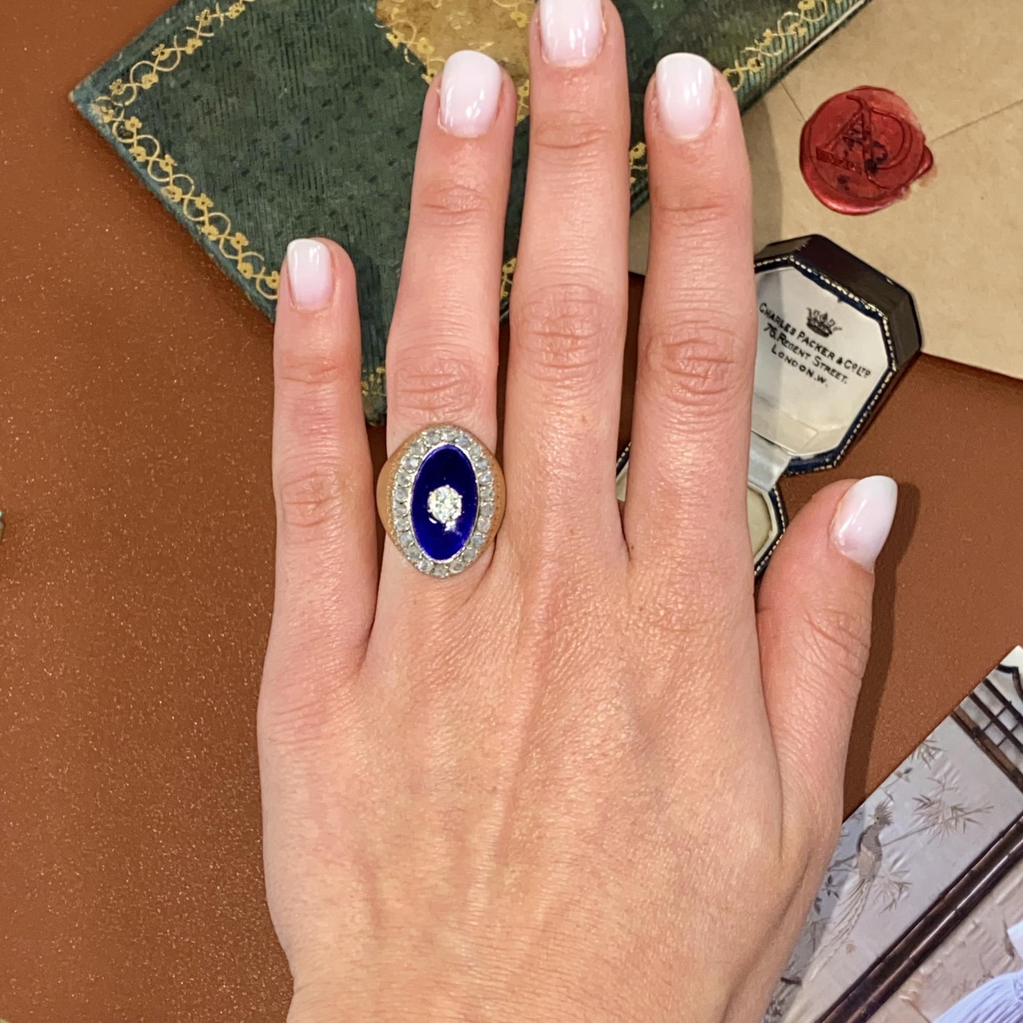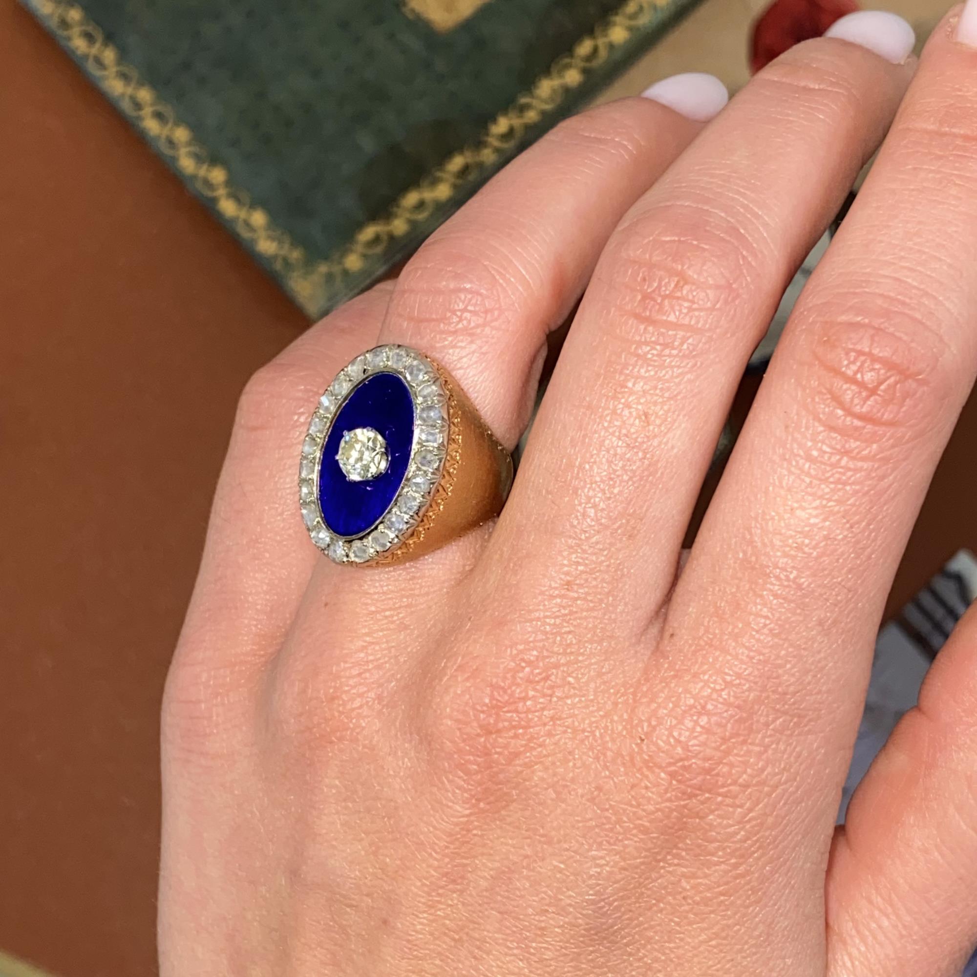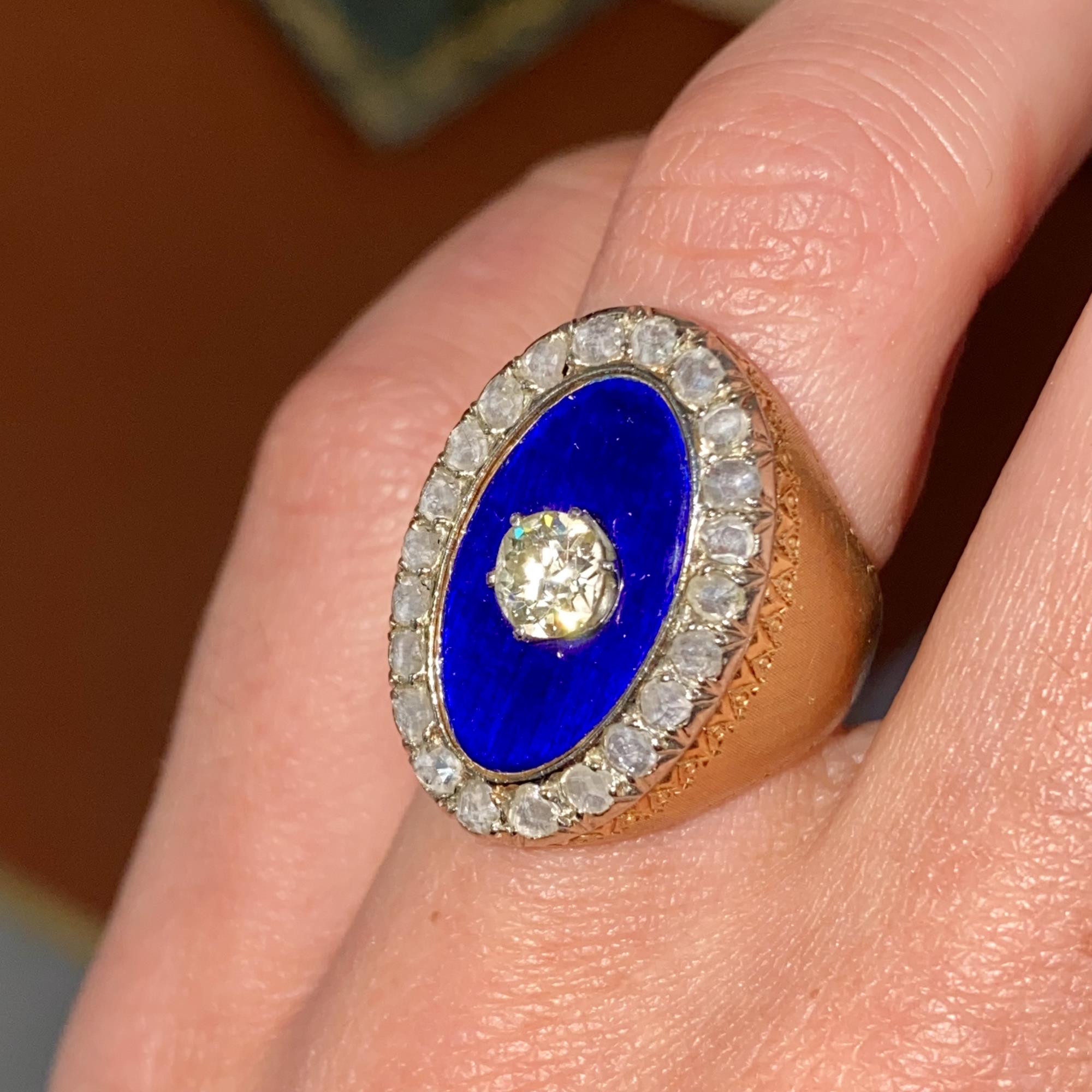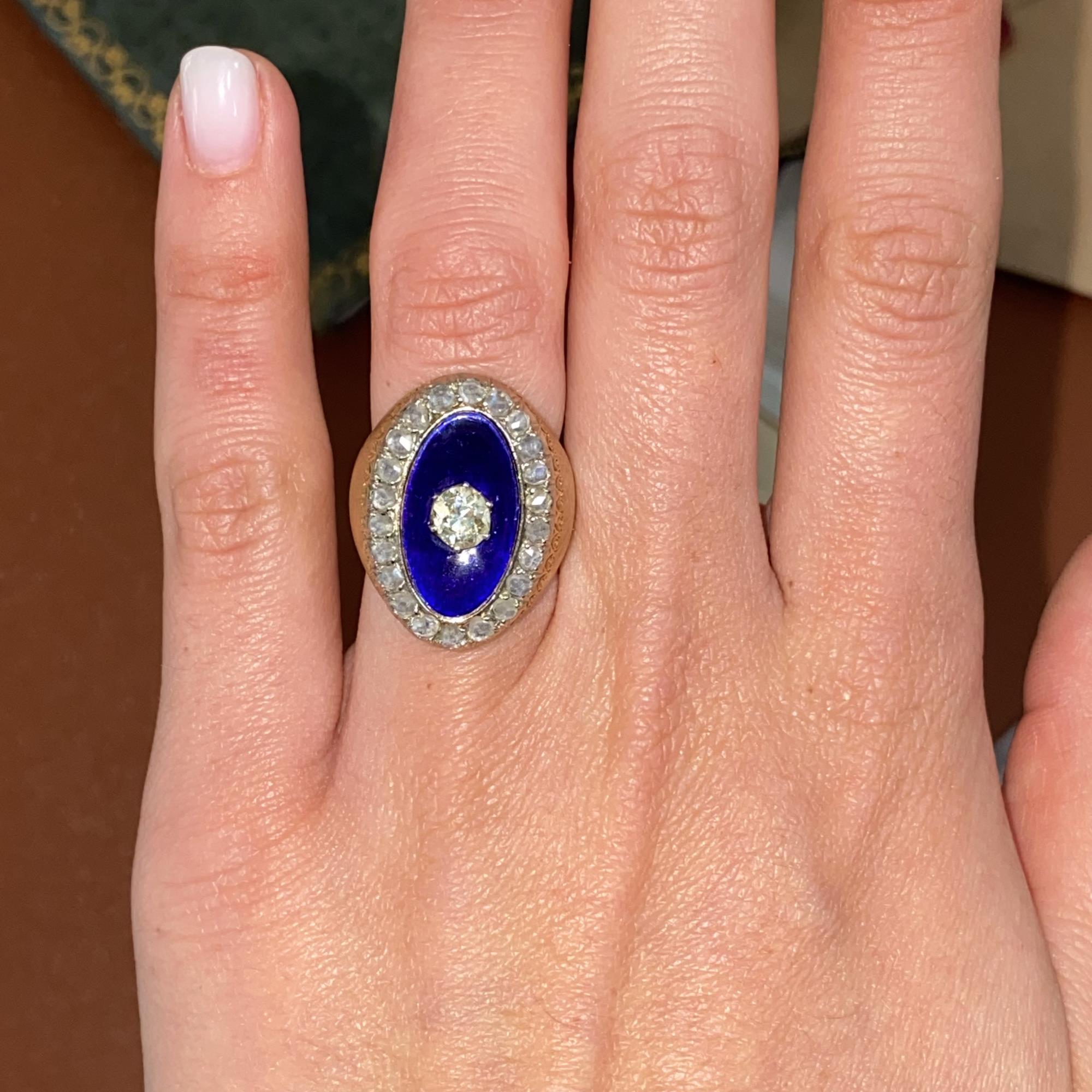 RARO E ANTICO ANELLO IN ORO 18KT CON DIAMANTI DI TAGLIO ANTICO CT 0,50 CA. E SMALTO BLU