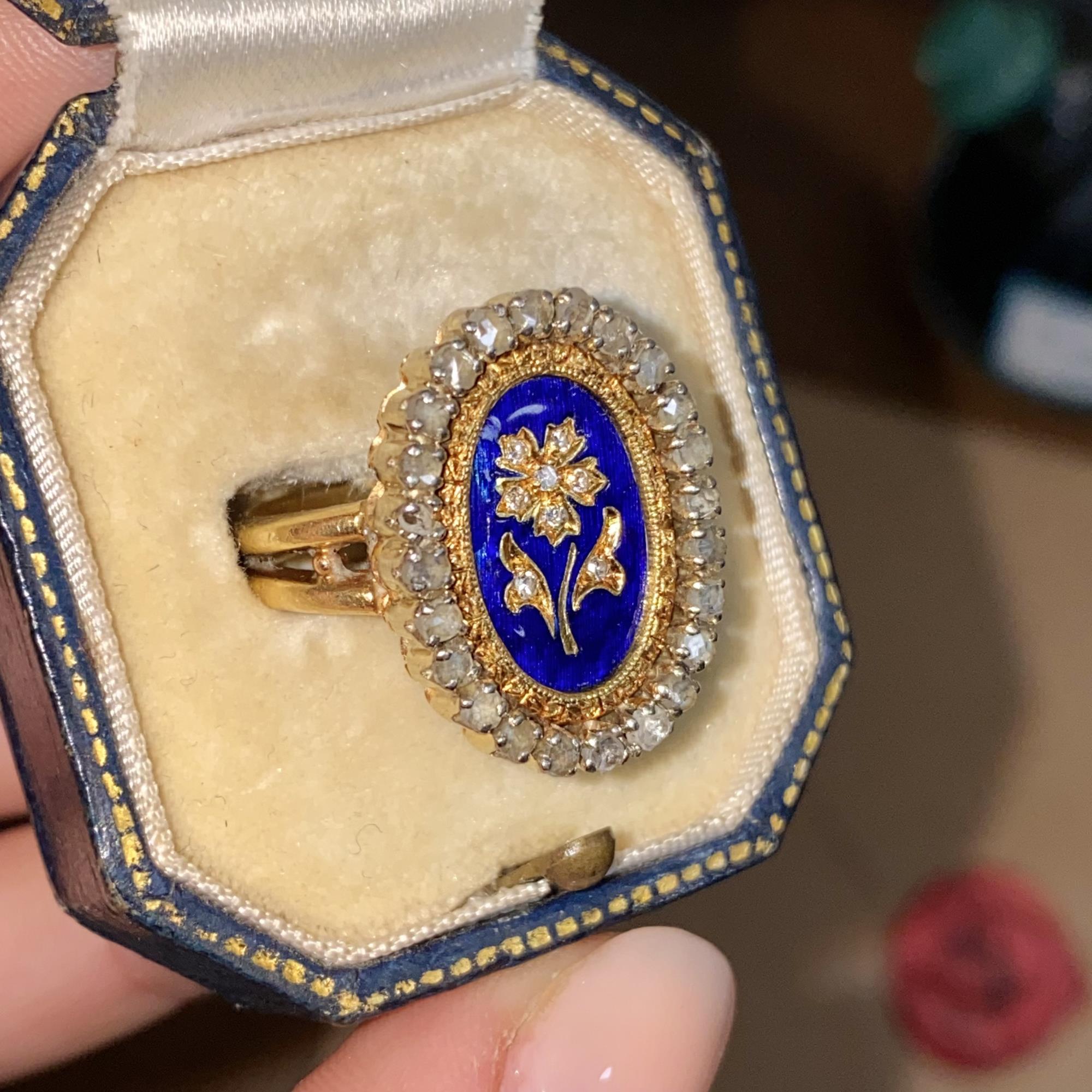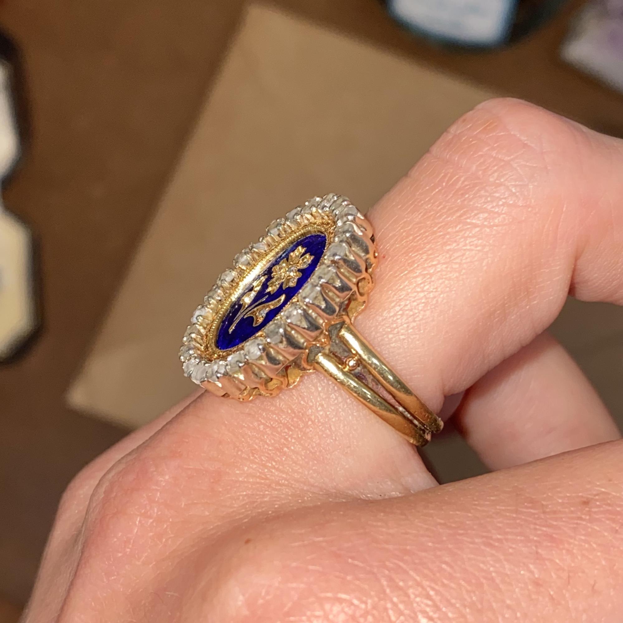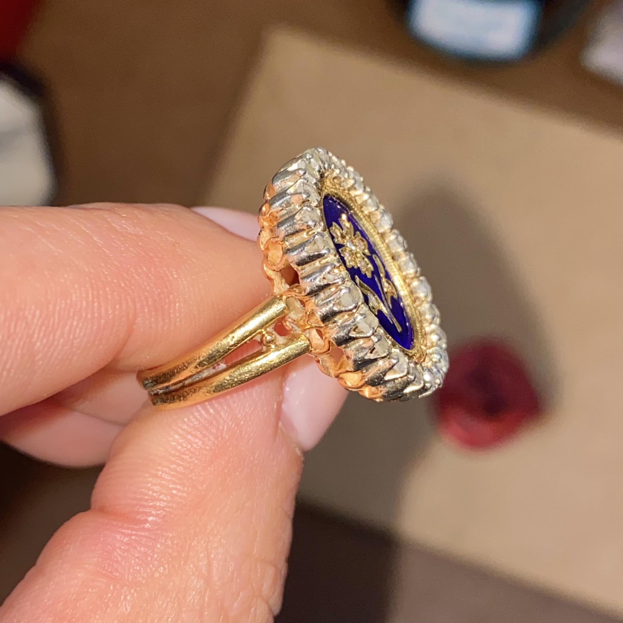 Oro 18kt, smalto blu e diamanti taglio antico (rose cut).