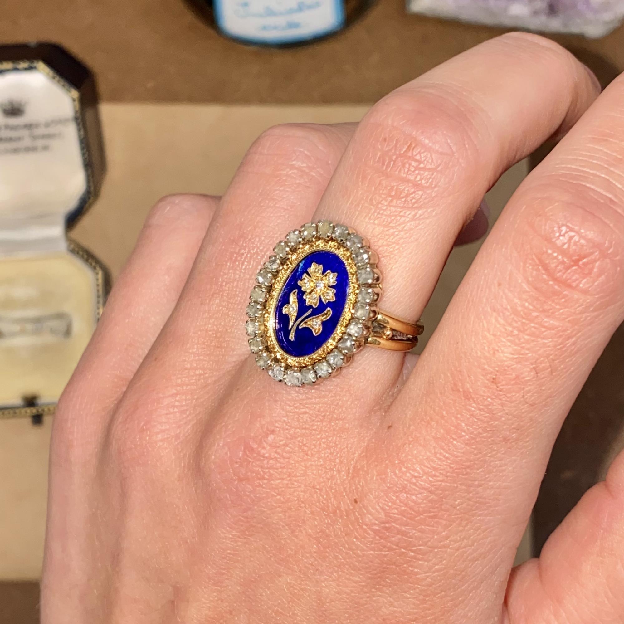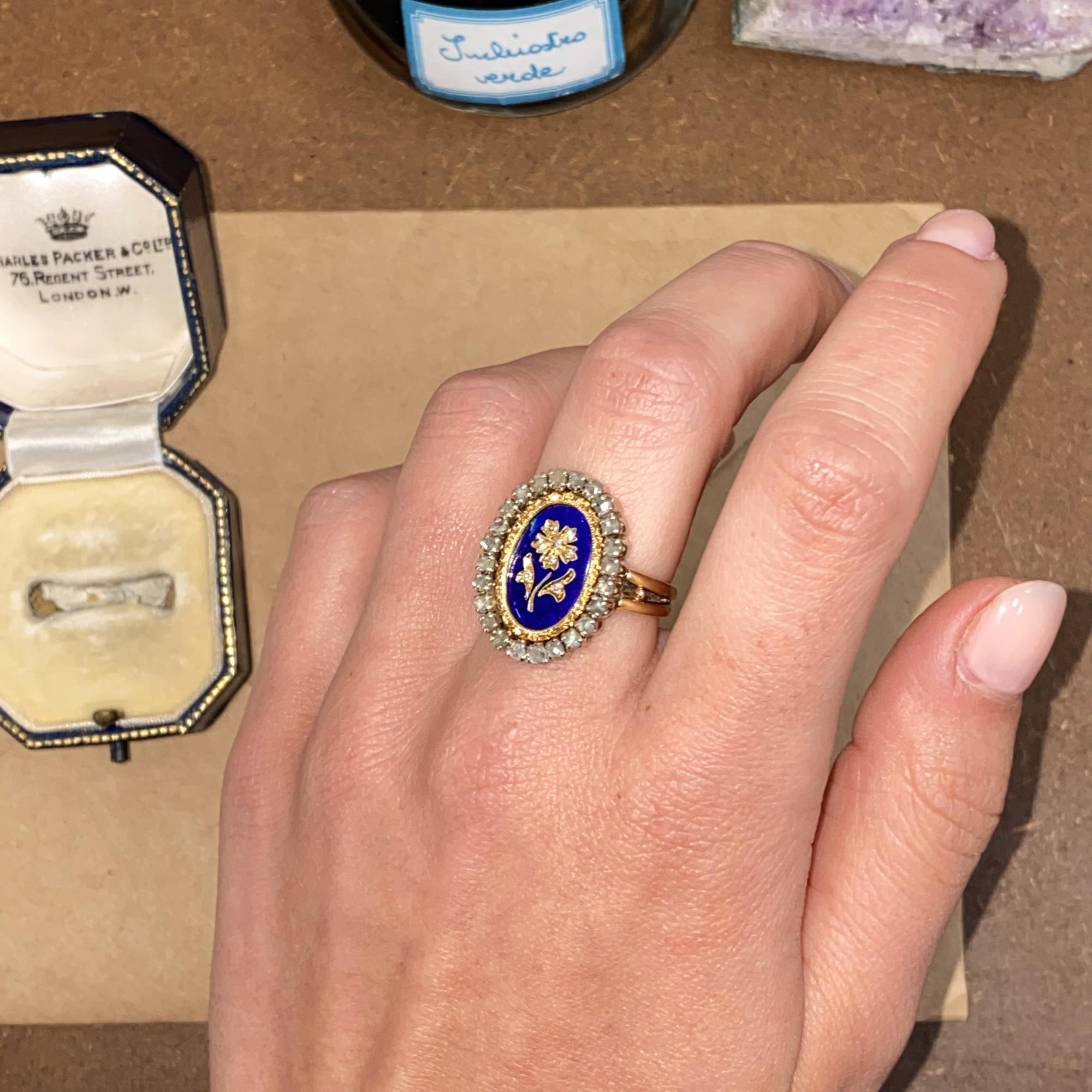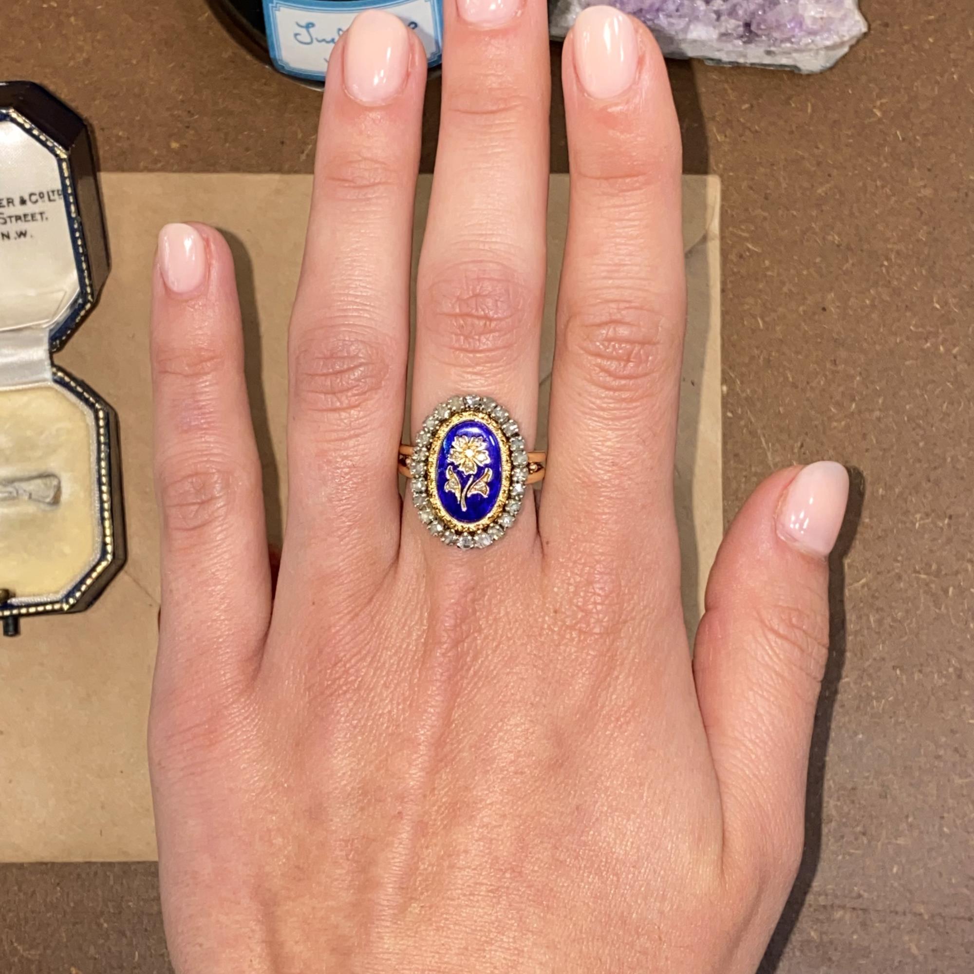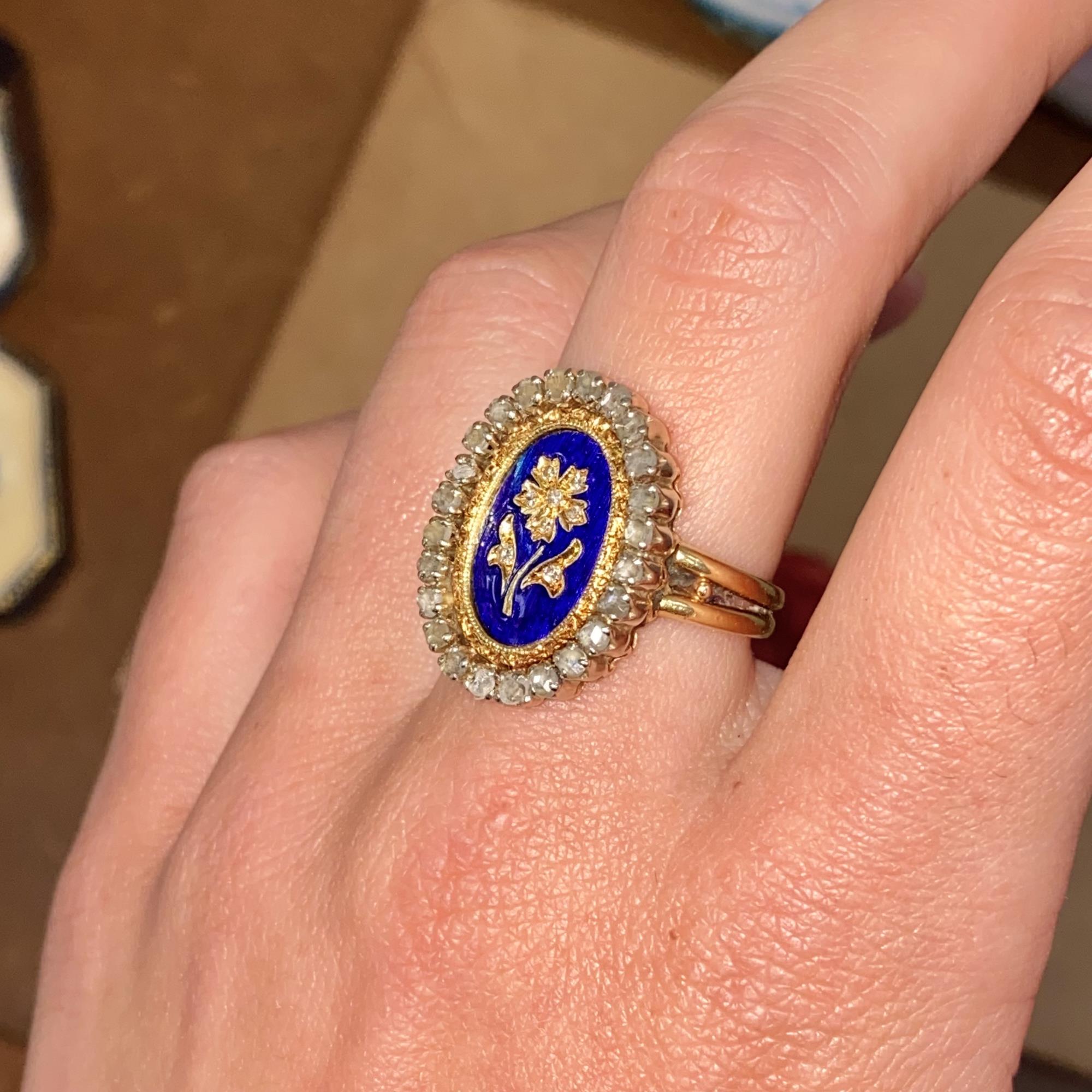 Oro 18kt, smalto blu e diamanti taglio antico (rose cut).