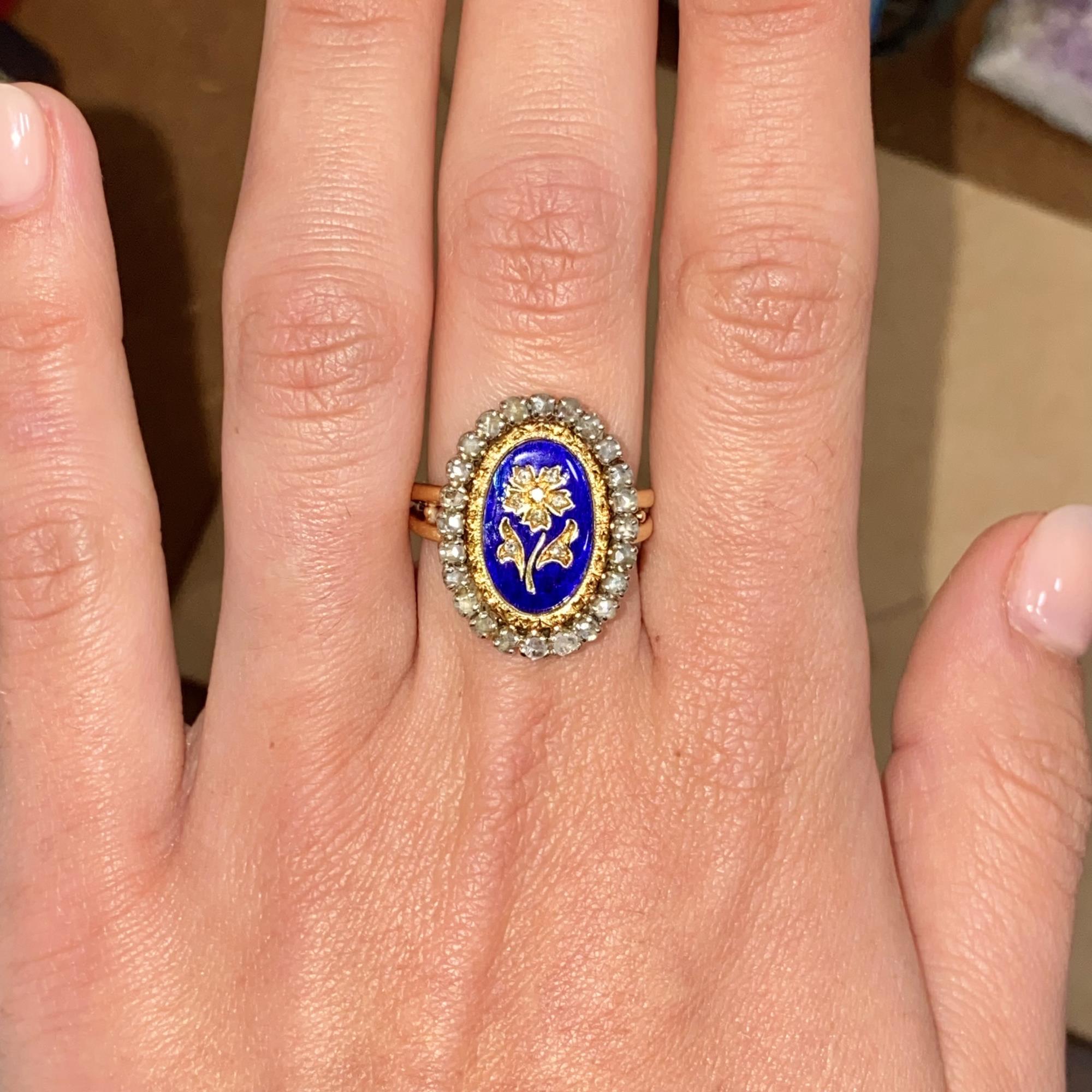 ANELLO ANTICO EDWARDIANO IN ORO 18KT, SMALTO BLU E DIAMANTI TAGLIO ANTICO CT 0,40 CA.