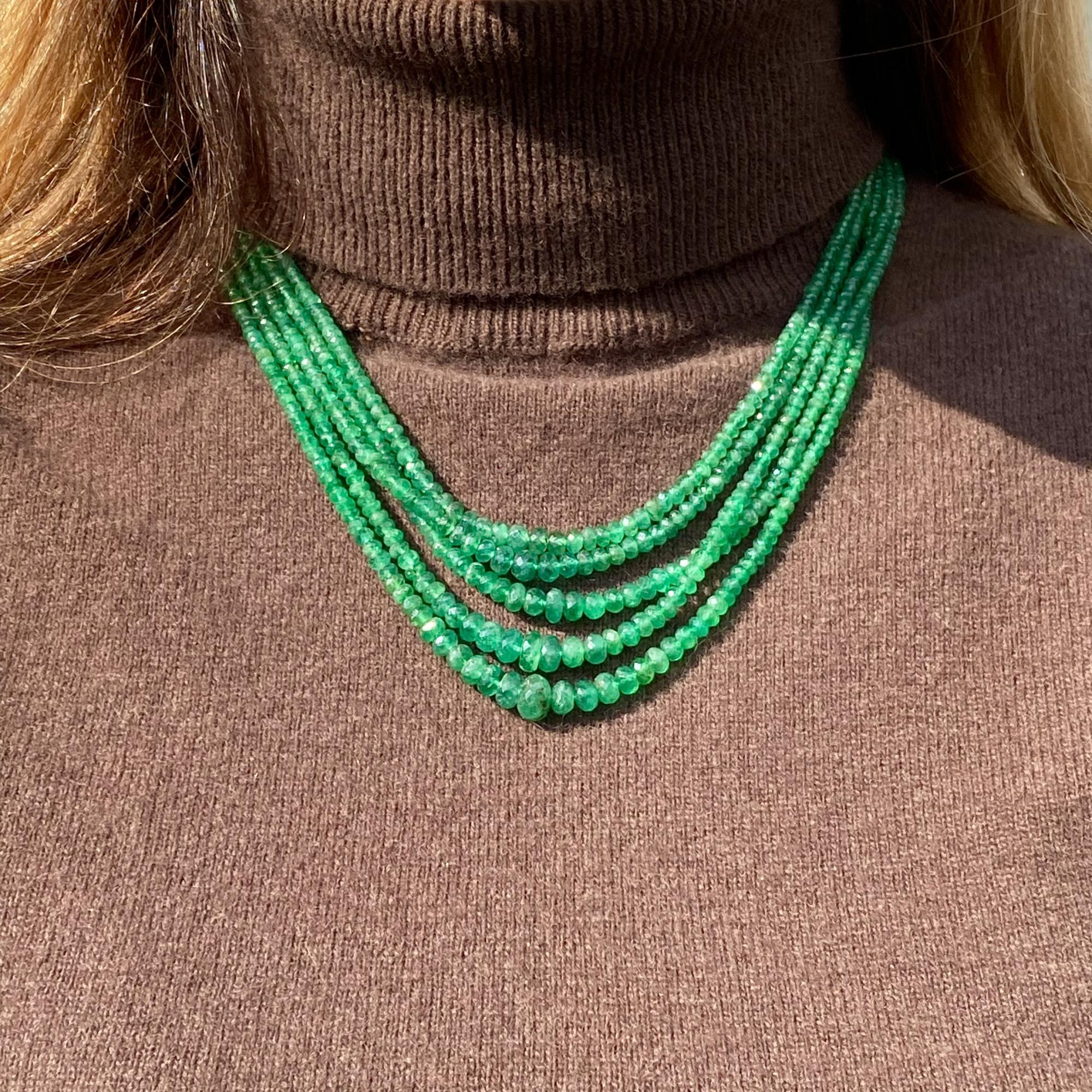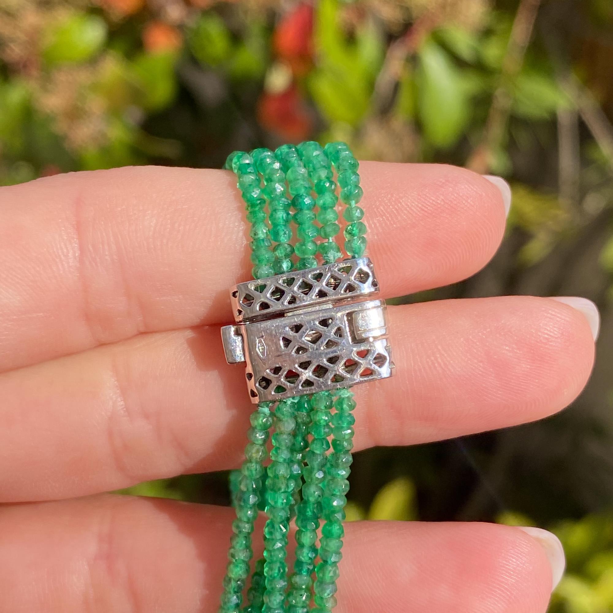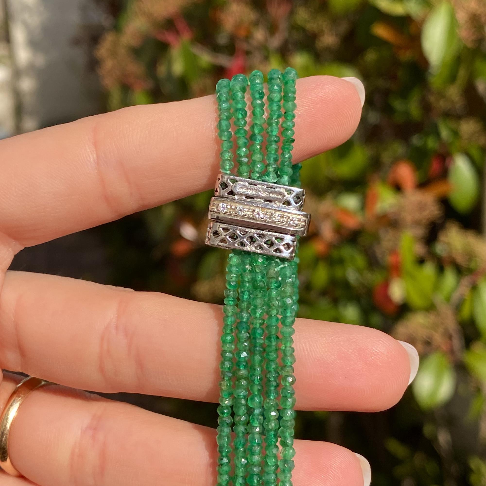 Collana con chiusura in oro 18kt e diamanti, 5 fili di smeraldi naturali sfaccettati per ct 180 montati a scalare.