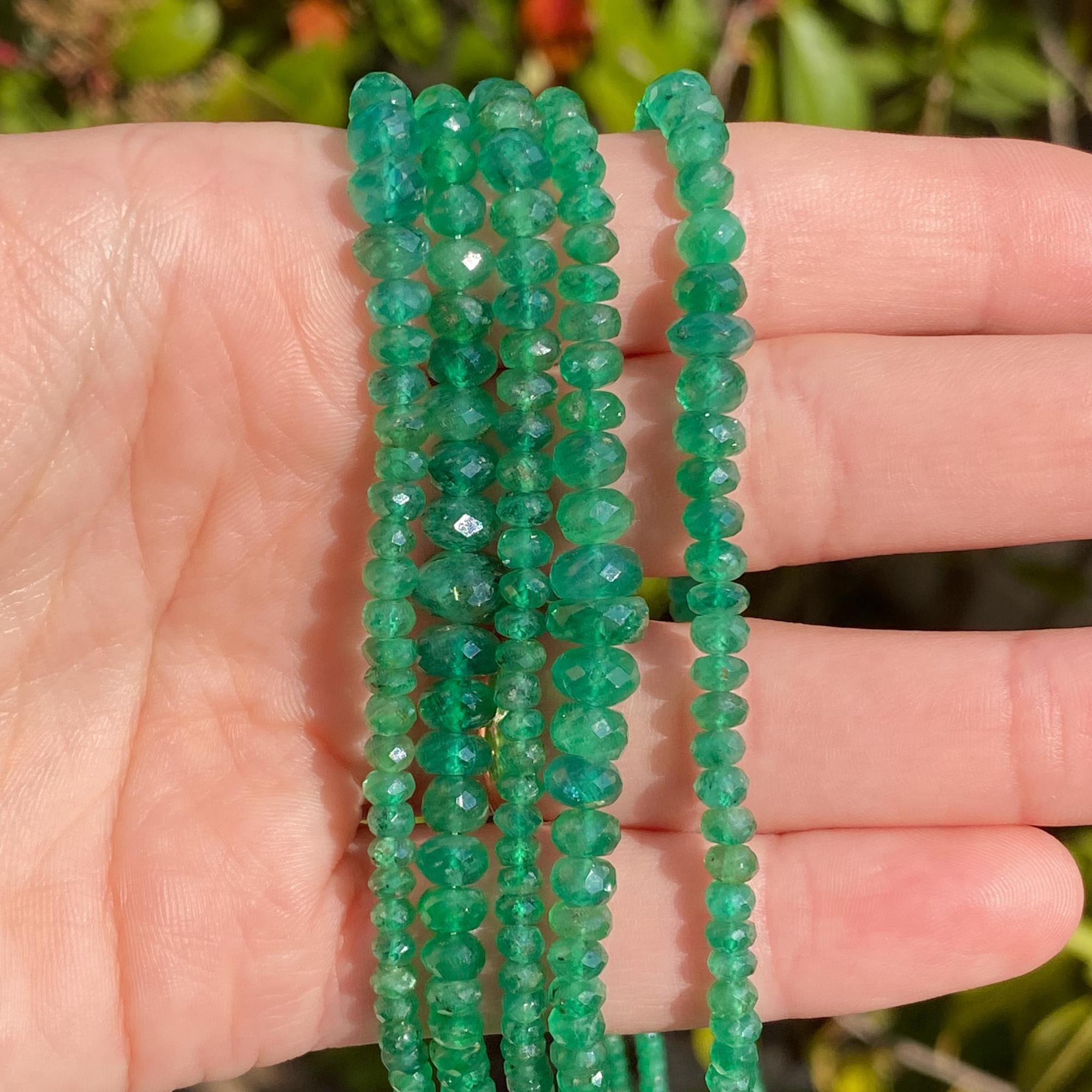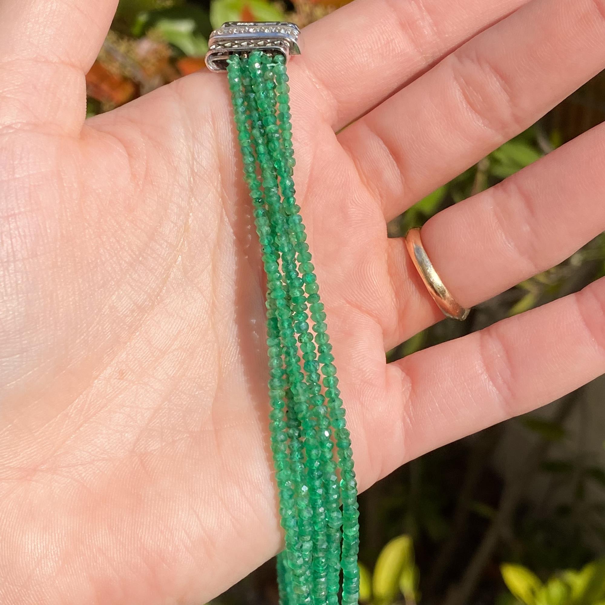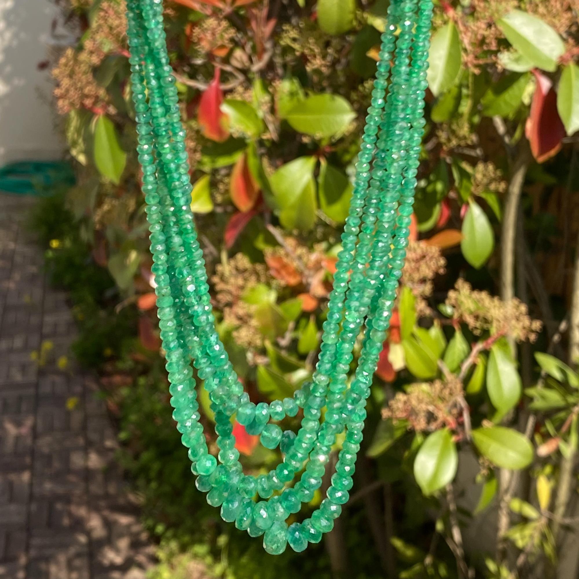 Collana con chiusura in oro 18kt e diamanti, 5 fili di smeraldi naturali sfaccettati per ct 180 montati a scalare.