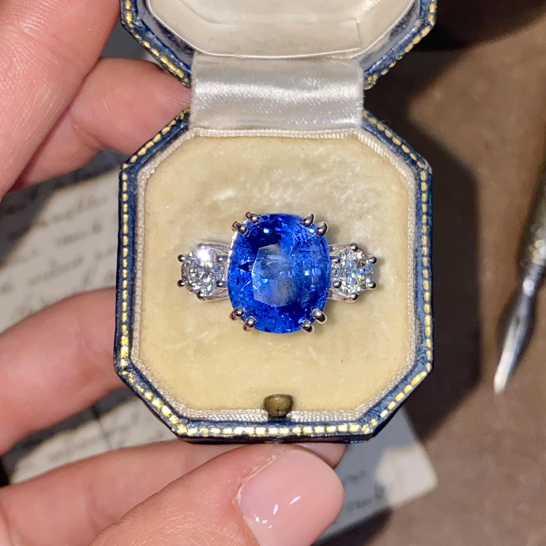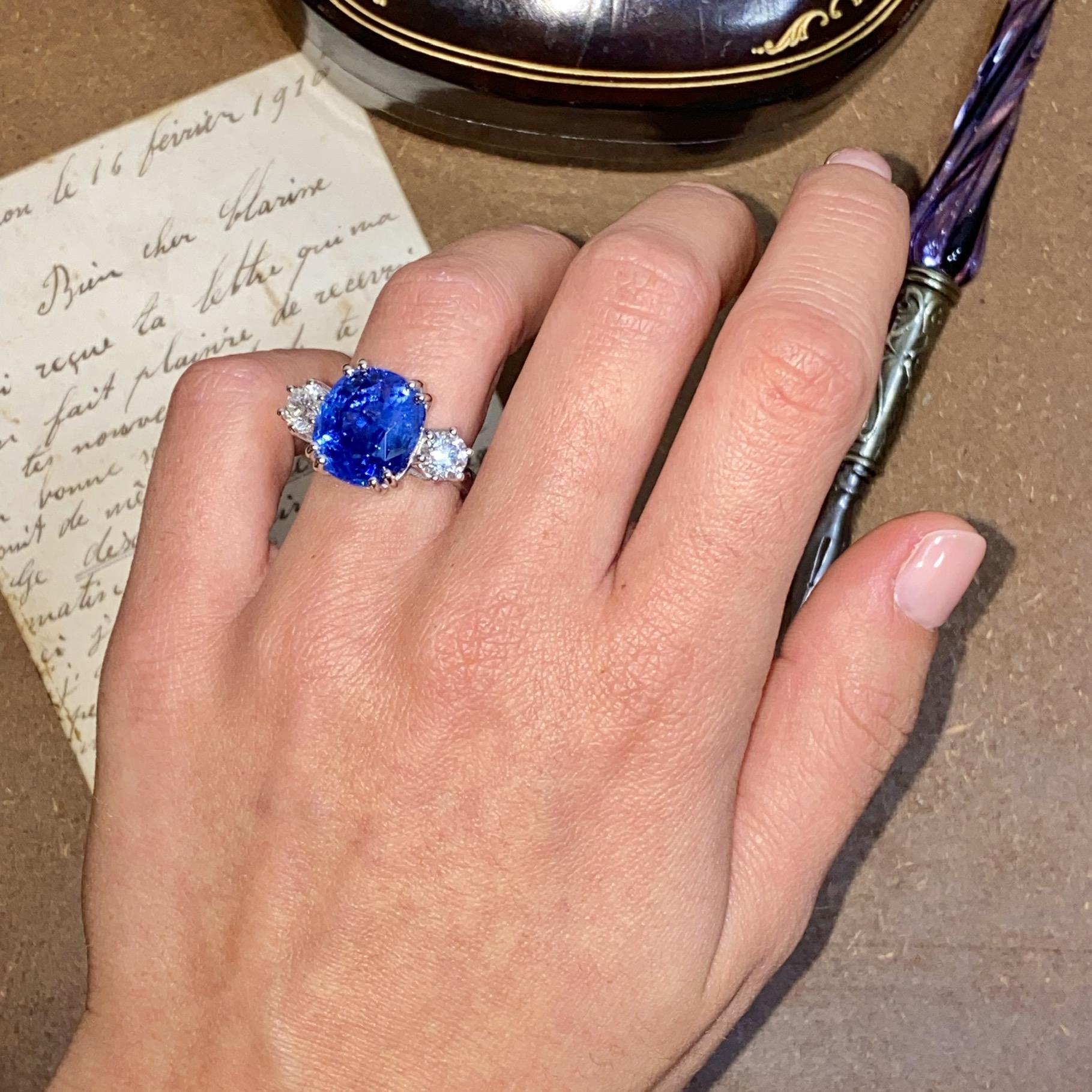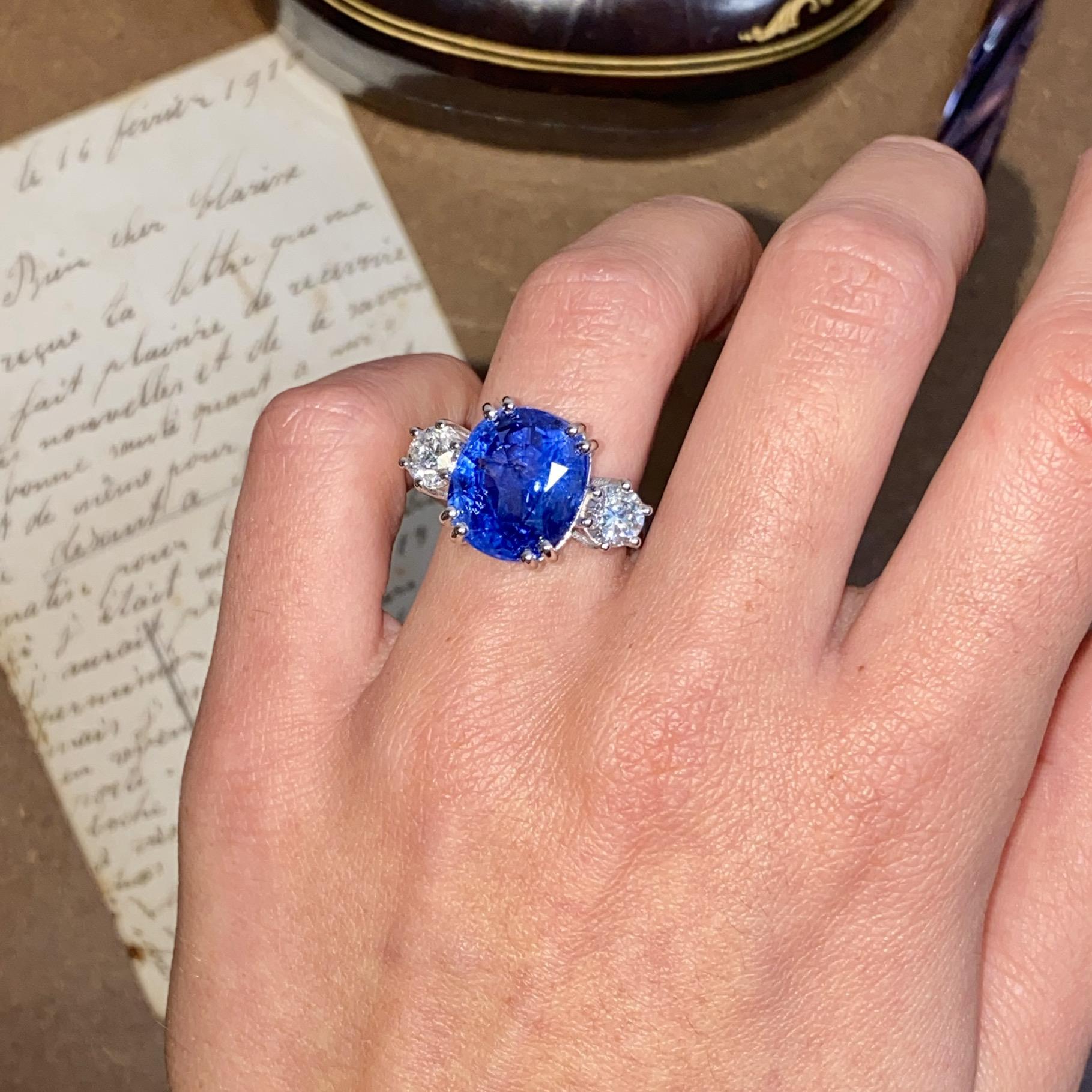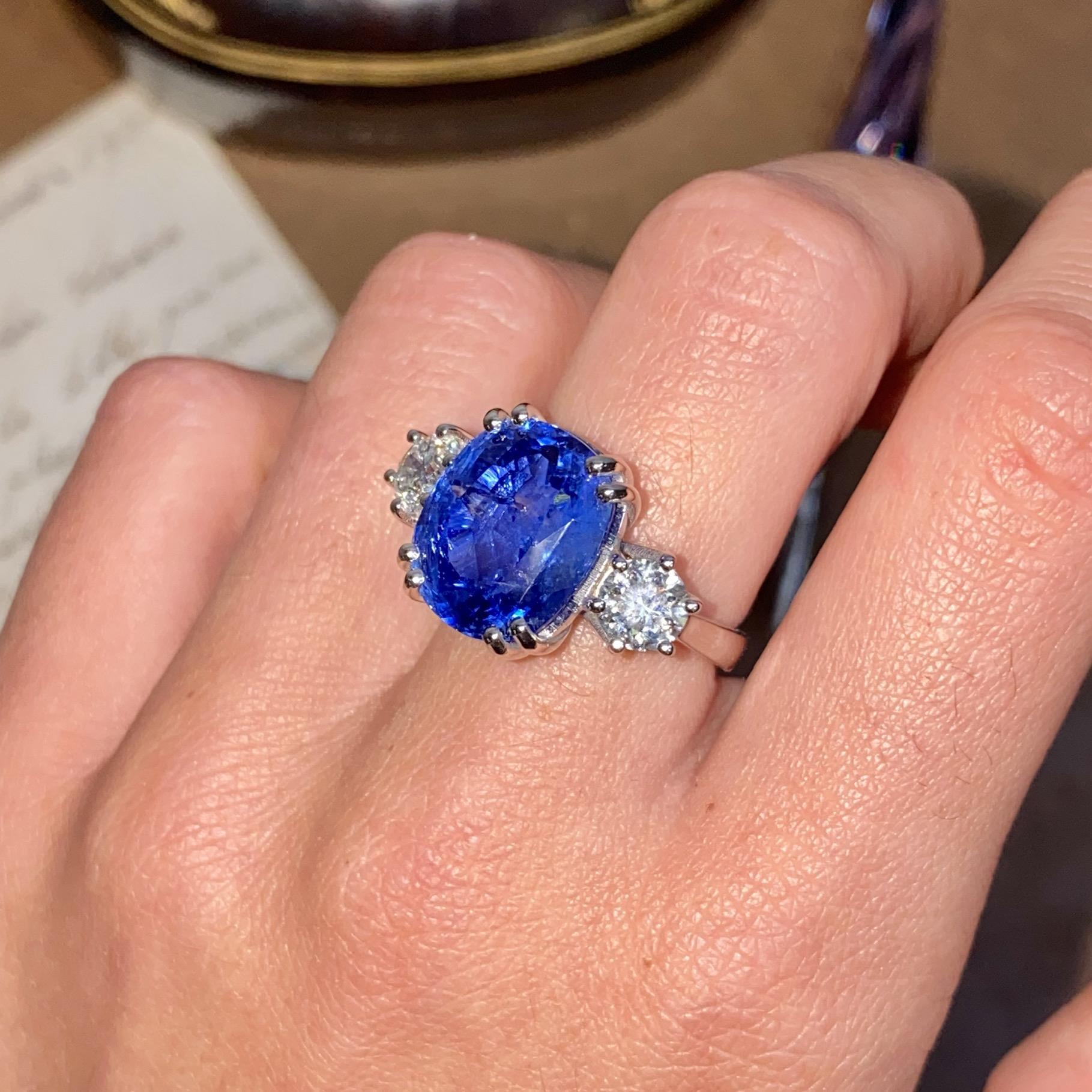 Alta gioielleria: anello in oro bianco 18kt, con zaffiro naturale di provenienza Ceylon taglio cuscino, colore blu trasparente, accompagnato da due diamanti naturali taglio brillante, colore F e purezza VS. Vedi certificato gemmologico in foto.
