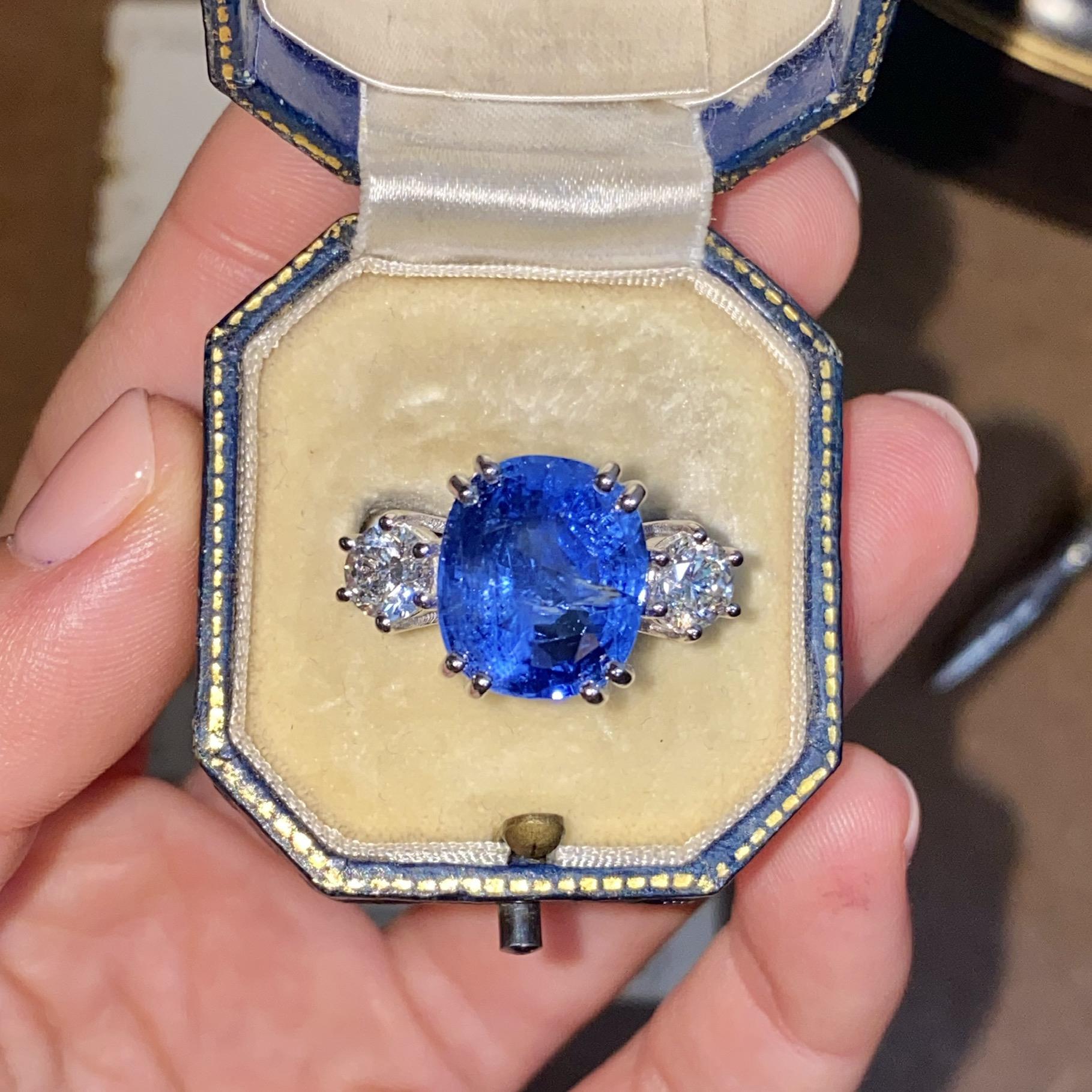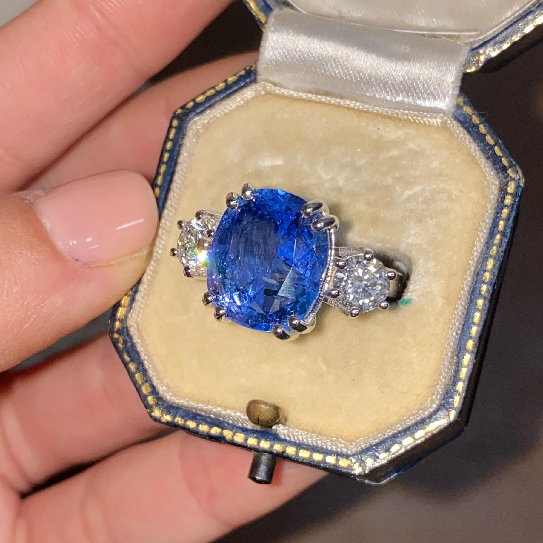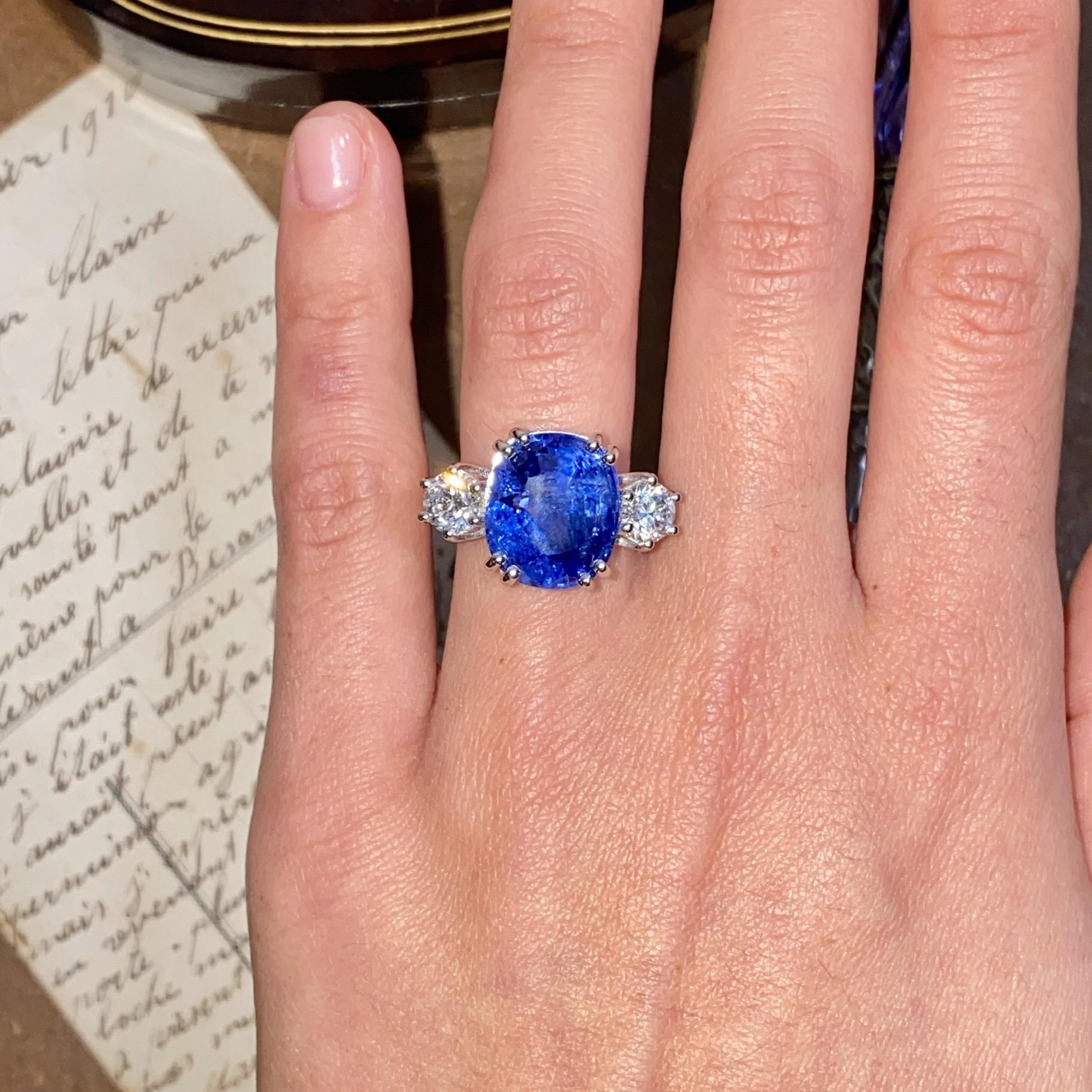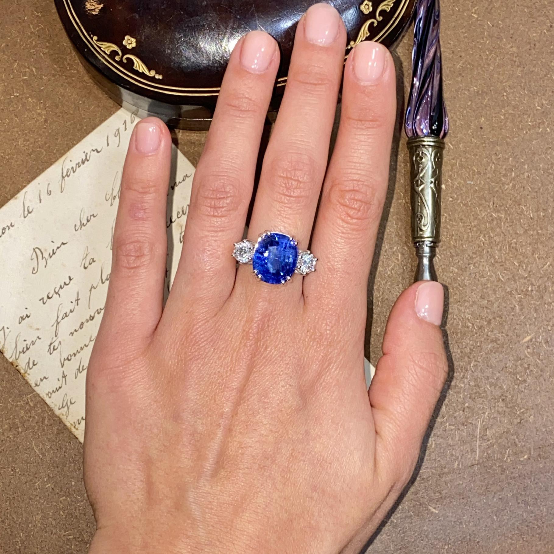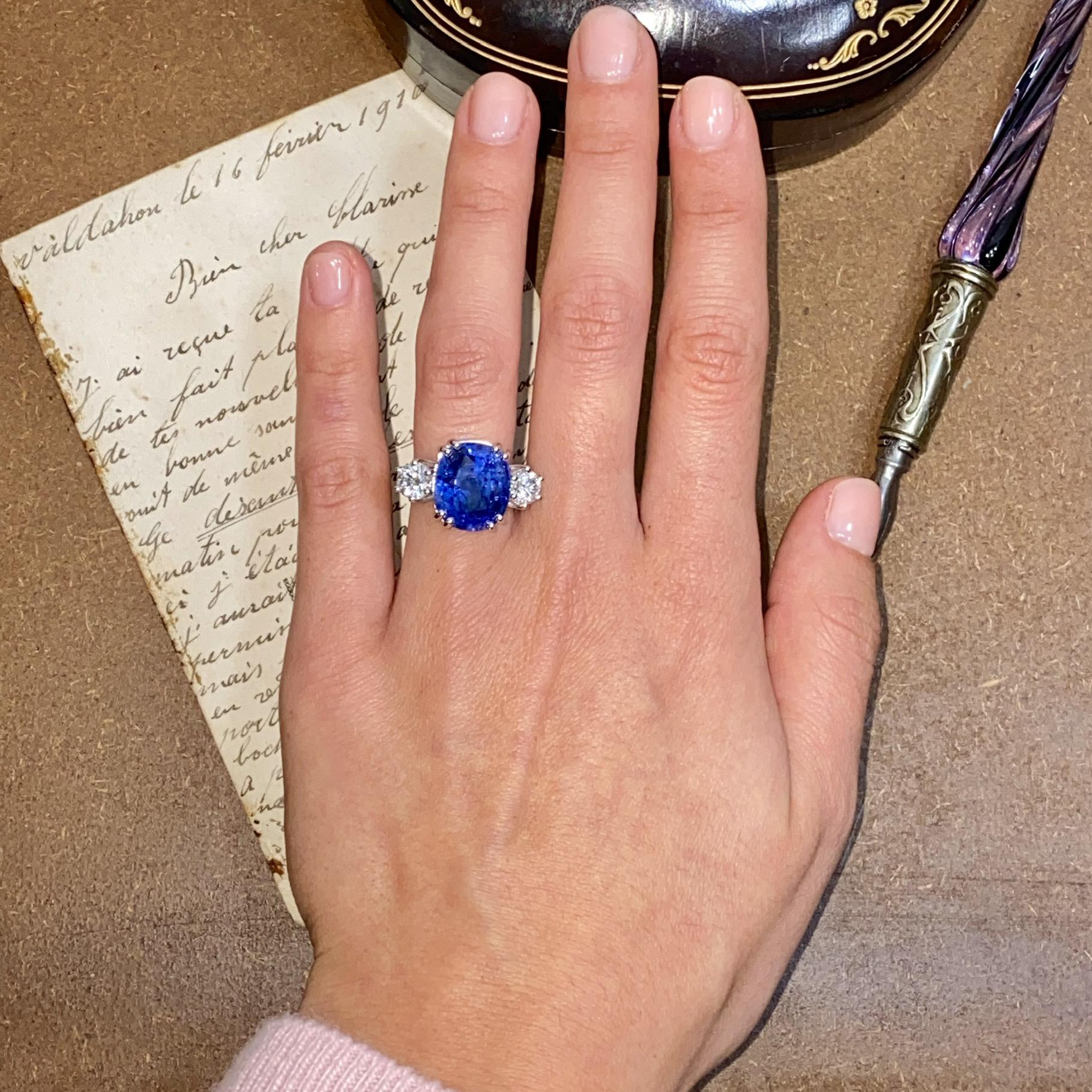 Alta gioielleria: anello in oro bianco 18kt, con zaffiro naturale di provenienza Ceylon taglio cuscino, colore blu trasparente, accompagnato da due diamanti naturali taglio brillante, colore F e purezza VS. Vedi certificato gemmologico in foto.