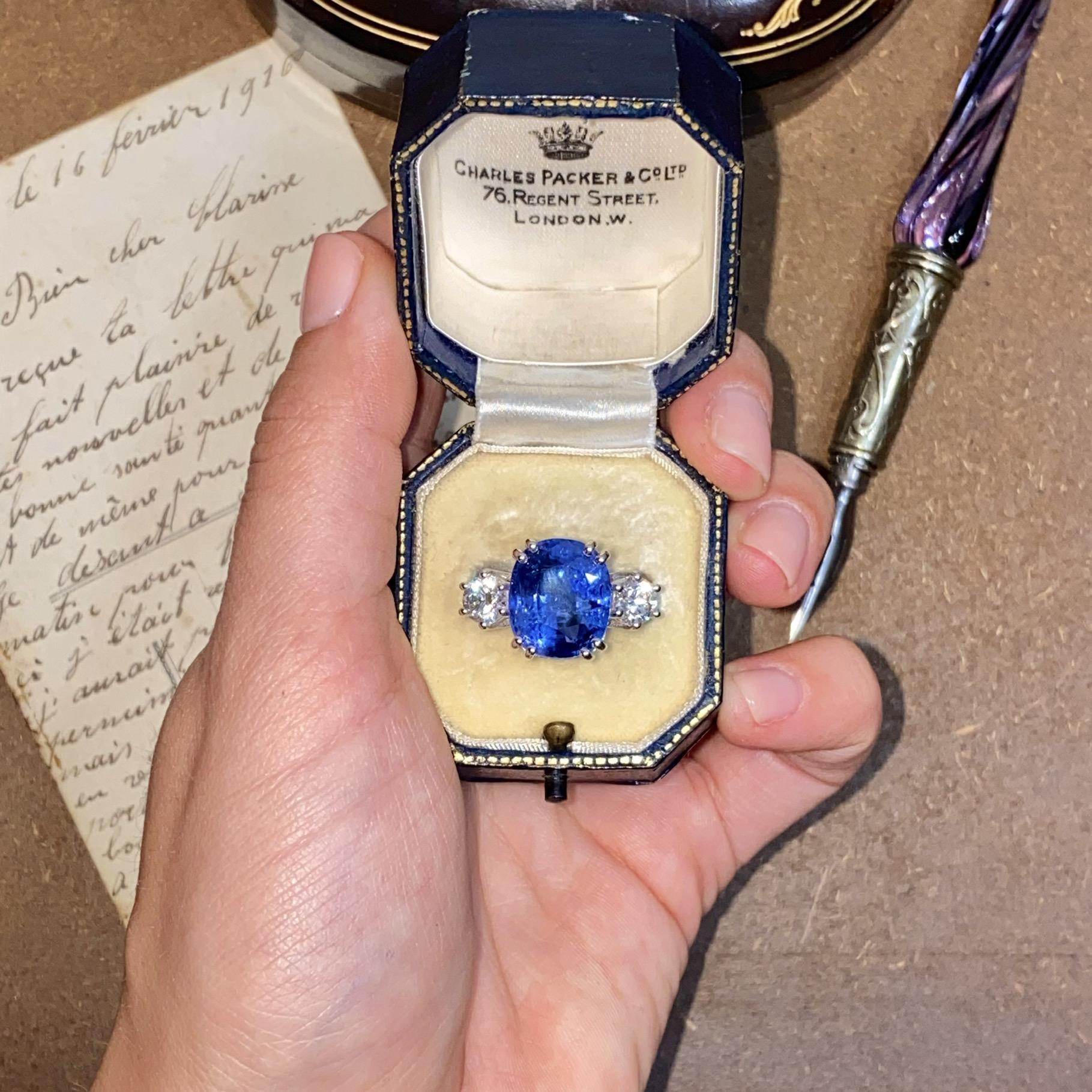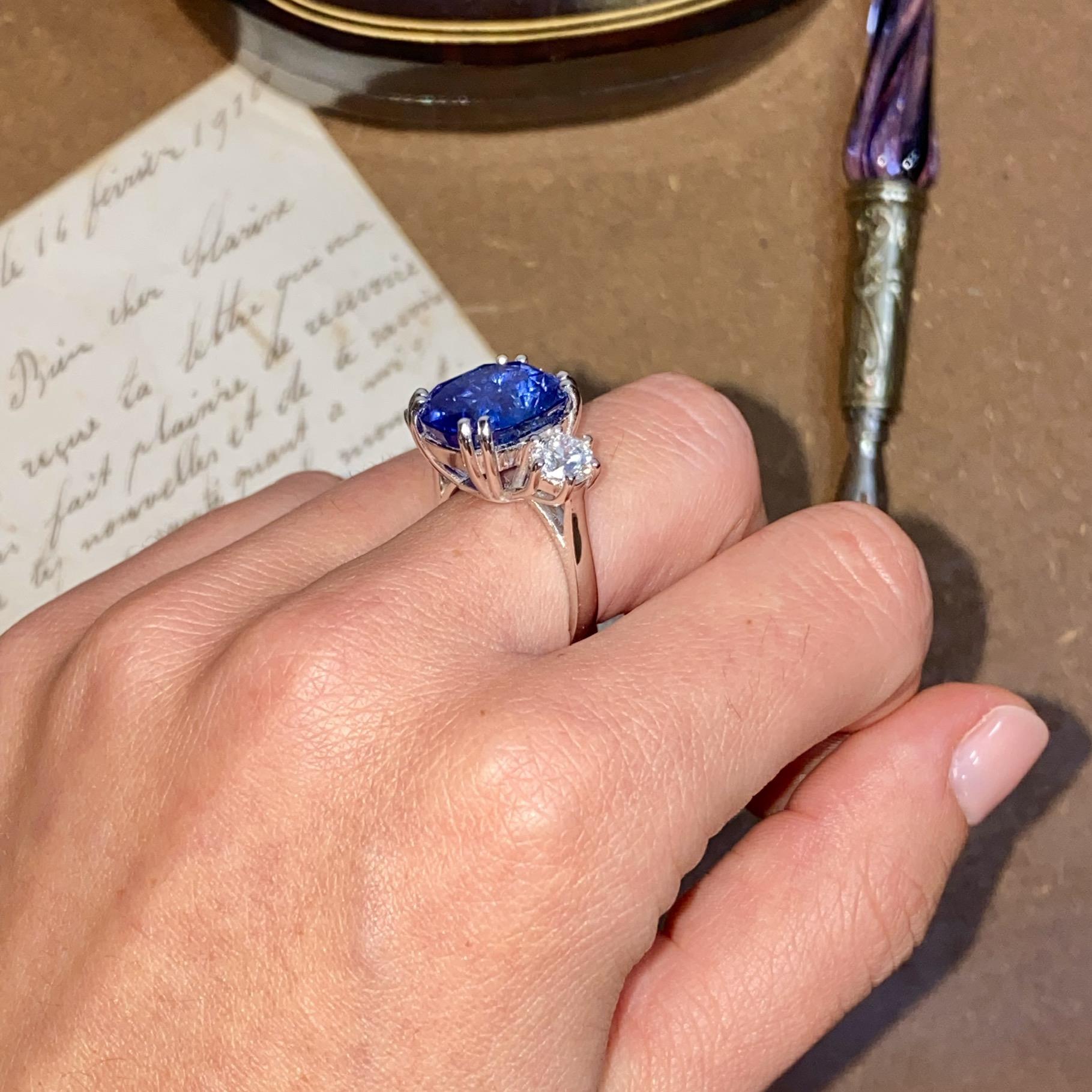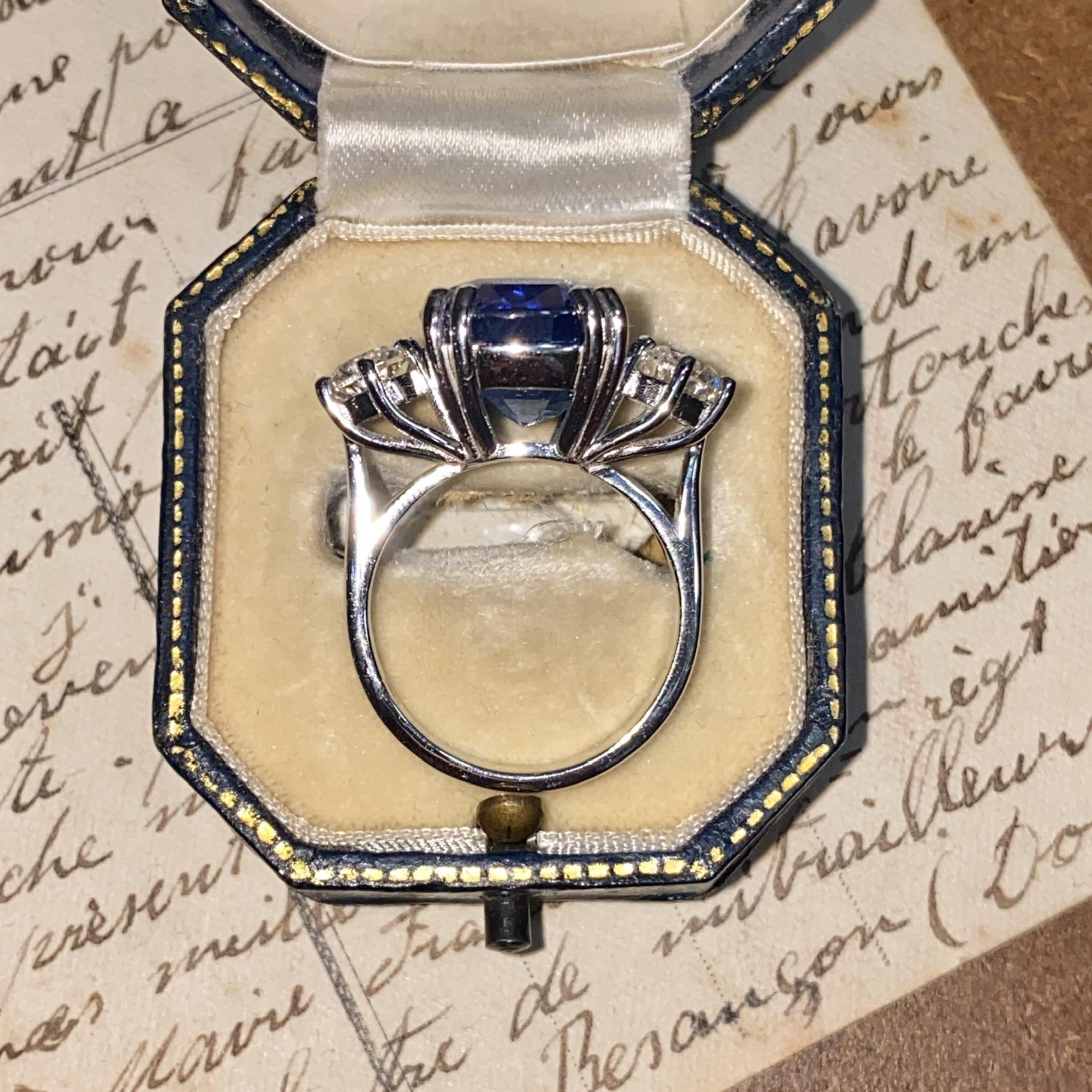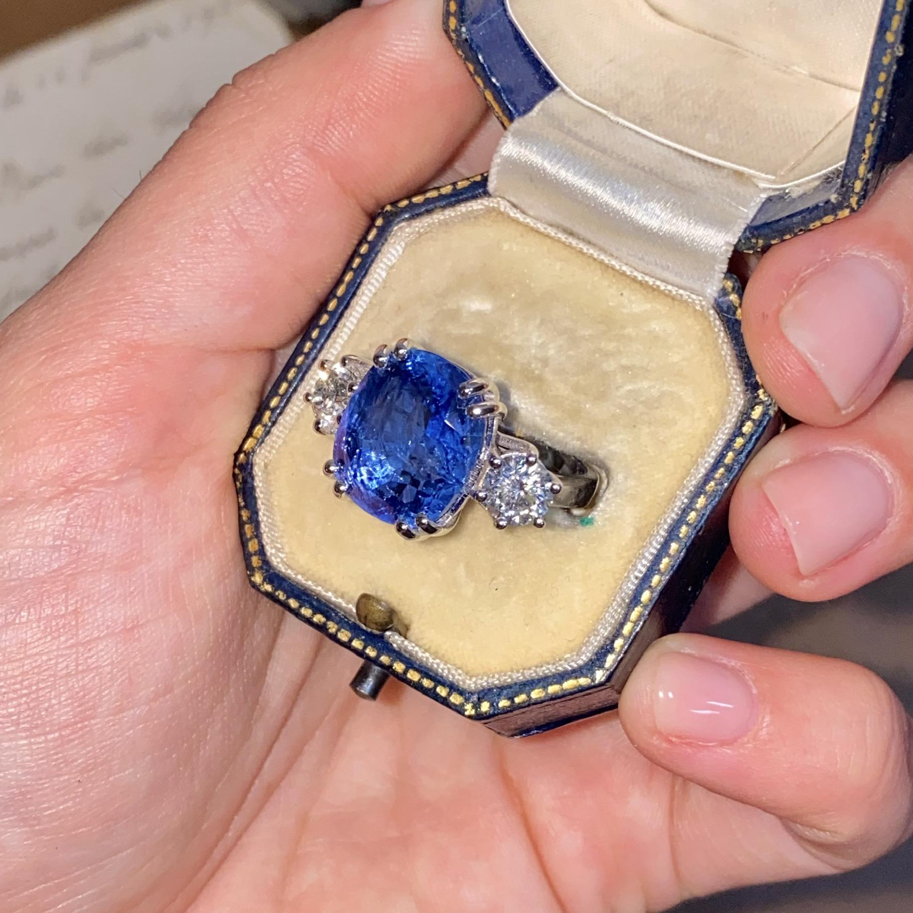 Alta gioielleria: anello in oro bianco 18kt, con zaffiro naturale di provenienza Ceylon taglio cuscino, colore blu trasparente, accompagnato da due diamanti naturali taglio brillante, colore F e purezza VS. Vedi certificato gemmologico in foto.