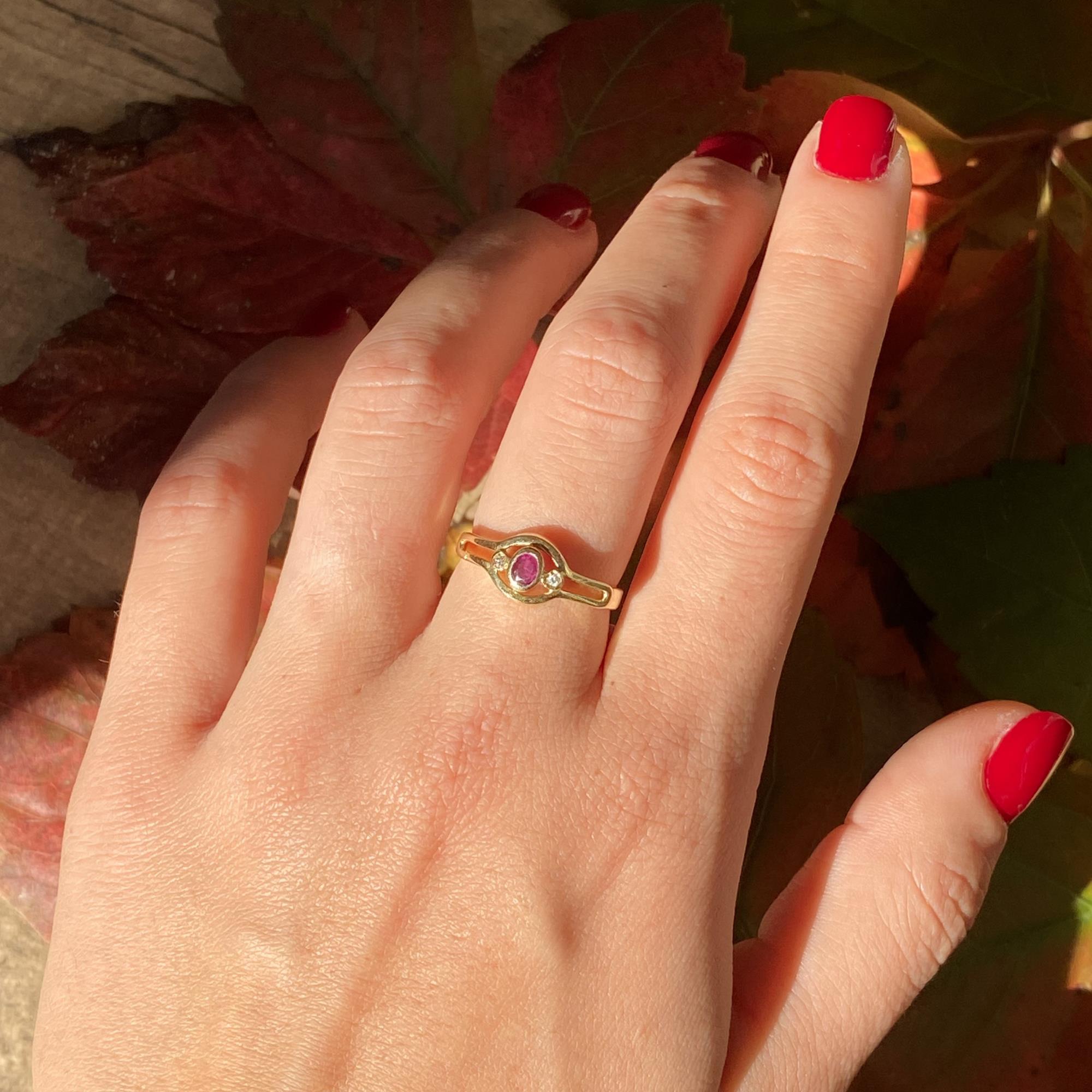 VINTAGE RING IN 18KT GOLD WITH A 0.10 CT CENTRAL RUBY AND TWO APPROXIMATELY 0.02 CT DIAMONDS.